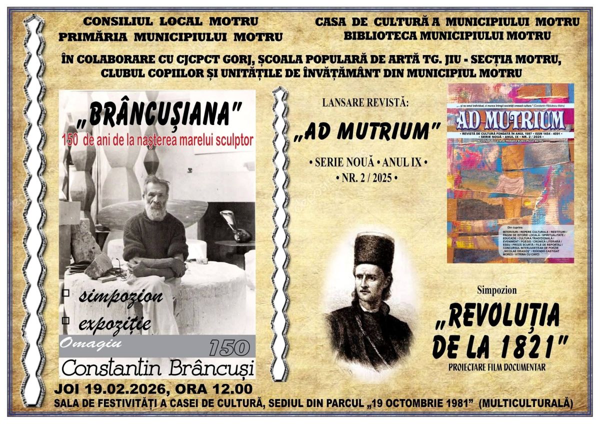 Un eveniment cultural deosebit s-a desfășurat joi, 19 februarie 2026, în Motru, reunind la Casa de Cultură a municipiului trei momente semnificative în program: „Brâncușiana” – manifestare omagială dedicată împlinirii a 150 de ani de la nașterea titanului de la Hobița, Constantin Brâncuși; Un moment evocator – Revoluția de la 1821 și importanța personalității lui Tudor Vladimirescu, cu prezentarea părții a IV-a a filmului documentar ,,Istorie, revoluție și legendă” și Lansarea revistei de cultură cu nr. 2/2025, Ad Mutrium, în cel de-al XXIX-lea an al existenței sale în spațiul revuistic local, o revistă cu calități grafice impecabile, cu un conținut bogat și divers: poezii, eseuri, dialoguri culturale, interviuri, reportaje, cronici, pagini de istorie locală, spiritualitate, proză scurtă, epigramă, evenimente, agenda culturală, vitrina cu cărți etc.