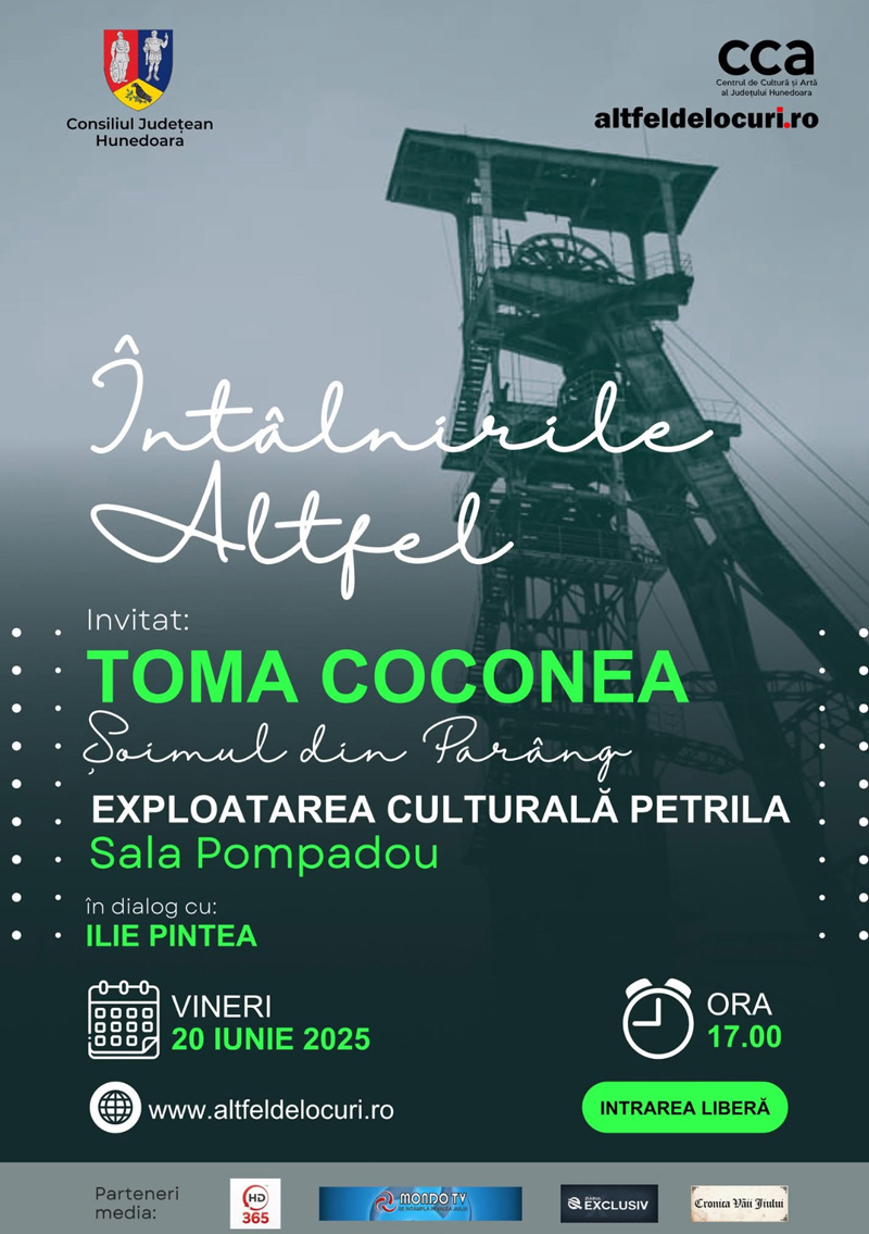 Exploatarea Culturală Petrila, ridicată pe amplasamentul fostei mine Petrila, acolo unde în 2008 au murit 13 mineri și alți 12 au fost răniți, găzduiește vineri seara o întâlnire de excepție cu parapantistul Toma Coconea. Cunoscut drept „Șoimul din Parâng”, cu participări de excepție la competiții de profil din Alpi, sportivul din Valea Jiului va participa la a doua ediție a „Întâlnirilor Altfel”, găzduite de jurnalistul Ilie Pintea, scopul discuțiilor de acest gen fiind acela de a readuce la viață spațiile din fosta exploatare minieră. „Centrul de Cultură și Artă al județului Hunedoara găzduiește cea de-a doua ediție a evenimentului „Întâlnirile Altfel”, care îl are ca invitat special pe unul dintre cei mai impresionanți sportivi de anduranță din lume: Toma Coconea.