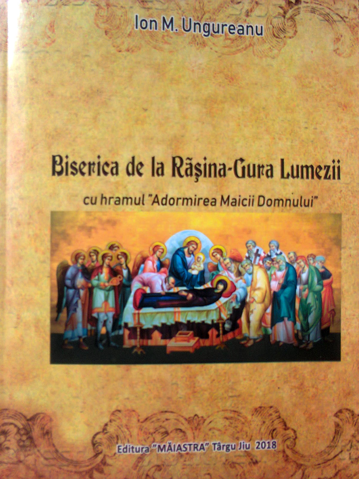 Aşa cum vinul bun e păstrat mai mulţi ani în butoi, la fel şi cărţile bune, se pare că e bine să fie păstrate mai multă vreme în sertarul aşteptărilor, până când vine momentul valorificării acelui tezaur negrăit pe care numai cuvintele de suflet îl transmit cu încredere şi cu mare nădejde în ceea ce Dumnezeu hărăzeşte a se împlini cu Voia Lui cea proniatoare şi binecuvântată prin har! Această monografie de suflet a remarcabilului cercetător-documentarist şi jurist cu aleasă vocaţie, care este domnul ION M. UNGUREANU, având un titlu obişnuit şi plin de substanţă ce se intitulează: «Biserica de la Răşina-Gura Lumezii» cu hramul «Adormirea Maicii Domnului», putem spune că reprezintă, fără îndoială, o lucrare de referinţă care porneşte de la un imbold lăuntric al sufletului acestui om, pe cât de modest, pe atât de minunat, mai exact, de la amintirea nepreţuitei sale mame, Constantina Ungureanu (Cidel), fiică a satului Răşina, acesta constituind acum un cartier care face parte din actualul Oraş Ţicleni. Apărută la Editura «Măiastra» cu aproape doi ani în urmă, această lucrare monografică are ca un temei durabil «credinţa strămoşească – filonul care i-a ţinut uniţi în cuget şi simţiri pe toţi românii», iar, pentru că «oricare scriere are o cauză», autorul însuşi devine patetic şi mărturiseşte cu fervoare că «sufletul nu mi-a dat pace până la împlinirea acestei dorinţe» exprimată în doar 80 de pagini dense şi cu atenţie pliate pe cele mai interesante aspecte care definesc şi conturează imaginea acestui lăcaş de cult.