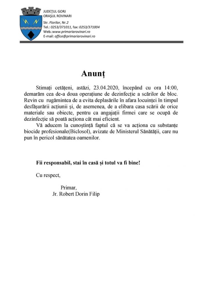 „Astăzi, 23.04.2020, începând cu ora 14:00, demarăm cea de-a doua operațiune de dezinfecție a scărilor de bloc. Revin cu rugămintea de a evita deplasările în afara locuinței în timpul desfășurării acțiunii și, de asemenea, de a elibara casa scării de orice materiale sau obiecte, pentru ca angajații firmei care se ocupă de dezinfecție să poată acționa cât mai eficient. Vă aducem la cunoștință faptul că se va acționa cu substanțe biocide profesionale(Biclosol), avizate de Ministerul Sănătății, care nu pun în pericol sănătatea oamenilor. Fii responsabil, stai în casă și totul va fi bine! „, le-a transmis rovinărenilor edilul Robert Filip.
