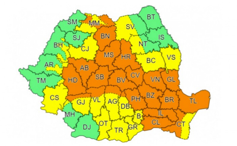 Meteorologii anunţă şi cod portocaliu, în intervalul 25 iunie, ora 11.00 – 26 iunie, ora 04.00. ”Pe parcursul zilei la munte, în centrul şi sud-estul ţării, iar seara şi noaptea mai ales în sud-est, local vor fi averse torenţiale, descărcări electrice, intensificări de scurtă durată ale vântului (rafale de 65…75 km/h) şi pe arii restrânse vijelii şi grindină. În intervale scurte de timp (1-3 ore) sau prin acumulare cantităţile de apă vor fi de 30…40 l/mp şi izolat de peste 50…60 l/mp”, a mai transmis ANM.