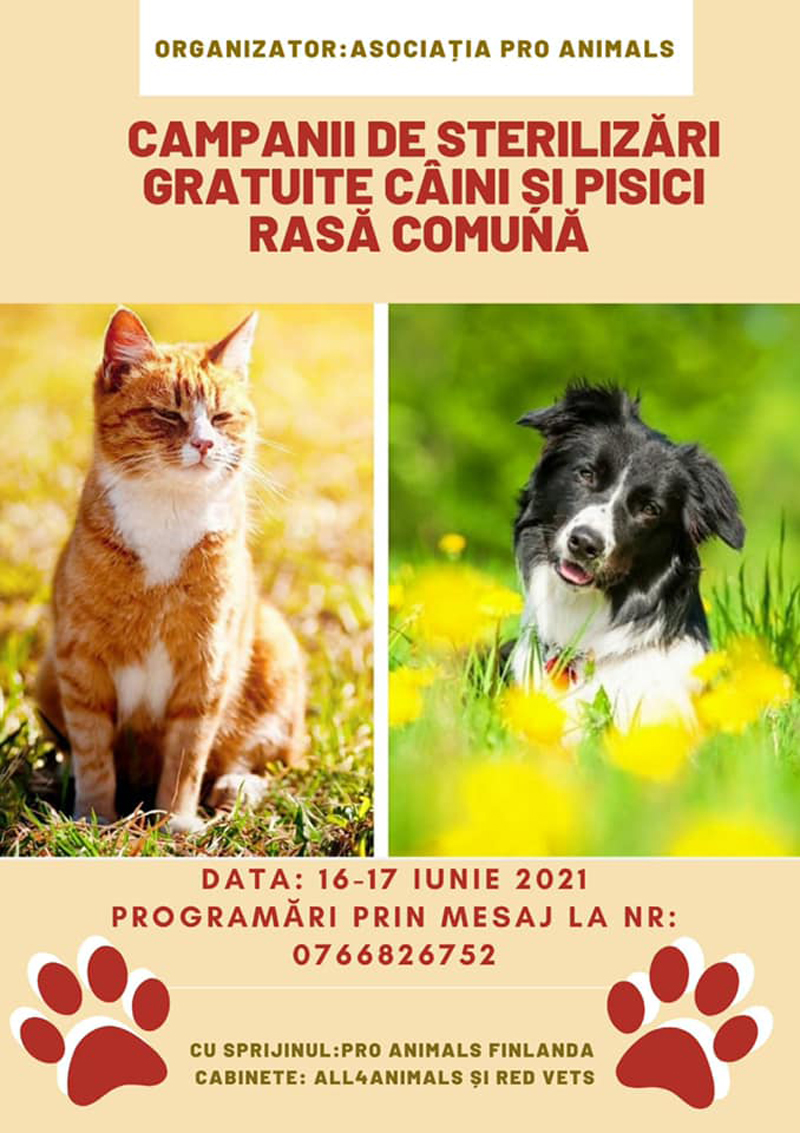 Şi în această lună, Asociaţia Pro Animals demarează o nouă campanie gratuită de sterilizări a câinilor şi pisicilor pentru proprietarii de animale din Târgu-Jiu. Sterilizările vor avea loc în zilele de 16 și 17 iunie 2021. „Locul câinilor și al pisicilor nu este nici pe străzi și nici în adăposturi, iar, din păcate, acestea sunt suprapopulate datorită înmulțirii necontrolate și abandonului (care se sancționează, conform legii în vigoare). Se pot steriliza câini și pisici, atât femele, cât și masculi, de rasă comună. Astfel că, dacă aveţi căţei/pisici acasă, în jurul blocului, pe lângă case sau în anumite zone, aduceţi-i la sterilizat, nu îi lăsaţi să se mai înmulțească! Animăluţele vor trebui ţinute într-un loc curat, sub supraveghere, minim 5-7 zile, post-operator! Anunțați-vă vecinii, prietenii sau rudele de acest program și contactați-ne printr-un mesaj pentru programare la numărul de telefon afișat (0766826752), iar noi vom reveni cu un telefon pentru confirmare. Şi tu te poţi implica. Cum? Mai jos sunt doar câteva idei: mediatizează acest program, fă voluntariat (împarte pliante, postere, organizează o campanie în oraşul/comuna/satul tău), fă o donaţie pentru ca un căţel/o pisică să poată fi sterilizaţi gratuit, donează 2% din impozitul pe venit. Împreună putem reduce numărul animalelor fără stăpân și să stopăm abandonul, cât şi cruzimile faţă de acestea! În județul Gorj organizăm campanii similare în diverse orașe/comune/sate pe baza solicitărilor primite din partea primăriilor sau din partea proprietarilor/iubitorilor de animale (cu un minim de 20 de animale programate). Vă rugăm să purtați mască de protecție, să respectați ora programării, cât și indicațiile primite telefonic pentru ca totul să se desfășoare în siguranță. Dacă nu puteți să ajungeți deși ați confirmat, anunțați-ne în timp util pentru a putea programa alt animăluț. Prioritate au câinii și pisicile de pe stradă, din adăposturi sau cei care aparțin persoanelor cu mai multe animăluțe și/sau cu venituri reduse. Vă rugăm, dacă vă permiteți financiar să sterilizați un animăluț, mergeți la un cabinet veterinar și lăsați locul liber pentru persoanele care nu își permit”, au transmis reprezentanții Asociaţiei Pro Animals Gorj.