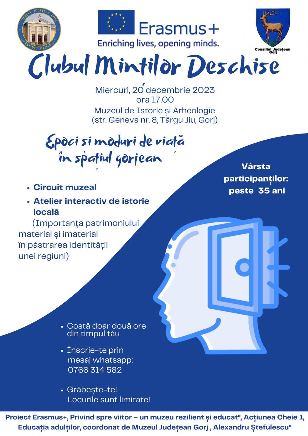 Clubul Minților Deschise, din cadrul Muzeului Județean Gorj „Alexandru Ștefulescu”, are o nouă provocare pentru gorjeni. Activitatea se desfășoară astăzi, de la ora 17:00, la sediul muzeului, din str. Geneva nr. 8, Târgu Jiu, sub genericul „Epoci și moduri de viață în spațiul gorjean”. Aceasta constă într-un tur muzeal, în expoziția de Istorie și Arheologie și un atelier interactiv de istorie locală, ce are în centrul atenției importanța patrimoniului material și imaterial în păstrarea identității unei regiuni.