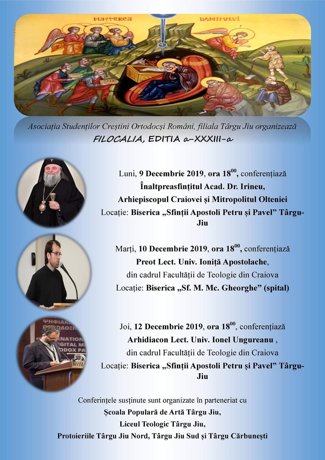 Cu acest prilej, în prima zi a manifestării, luni, 09 decembrie 2019, ora 18:00, la Biserica ”Sfinții Apostoli Petru și Pavel” din Târgu Jiu, va conferenția Înalpreasfințitul Acad. Dr. Irineu, Arhiepiscopul Craiovei și Motropolitul Olteniei.