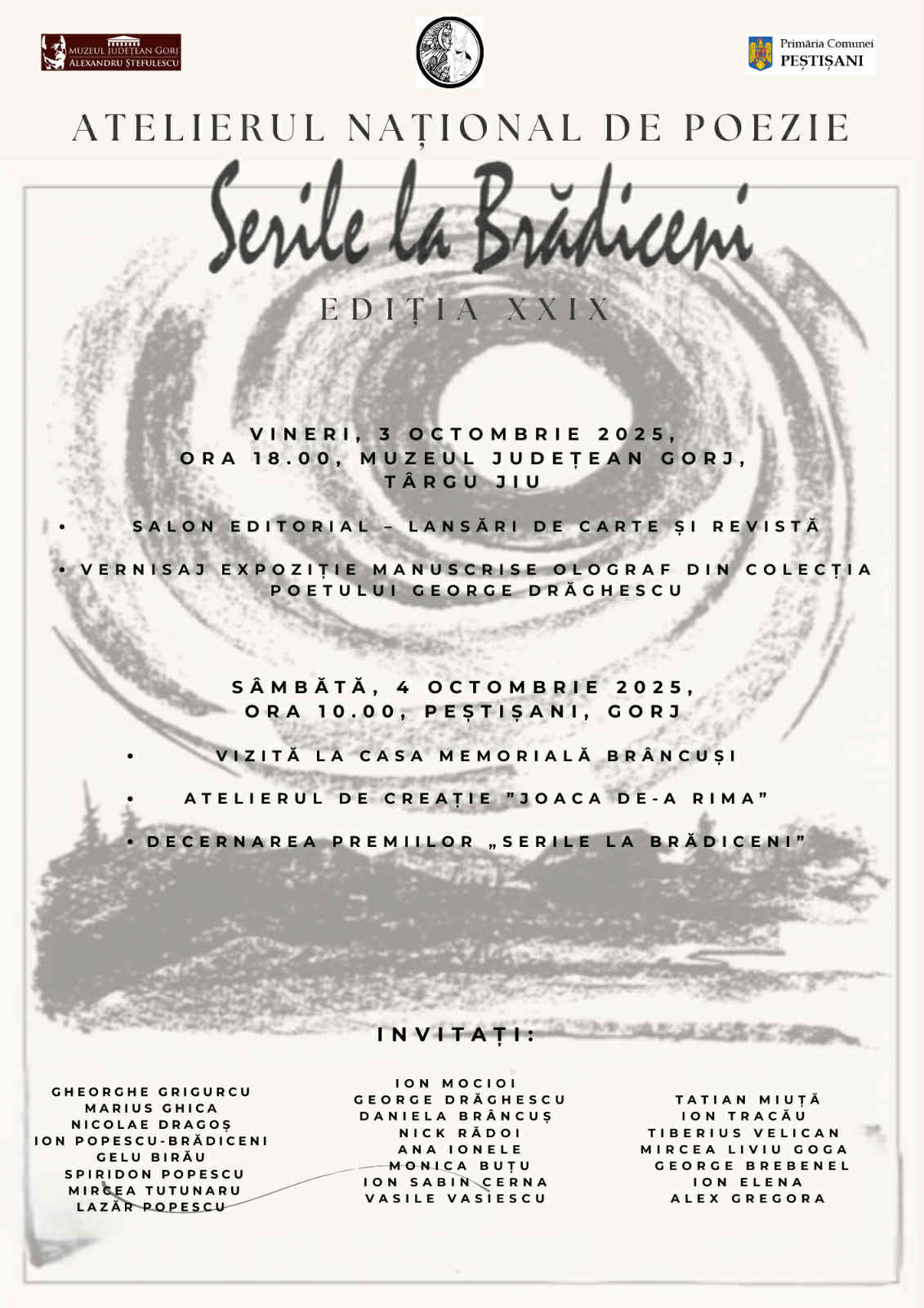 Centrul Județean pentru Conservarea și Promovarea Culturii Tradiționale Gorj, în parteneriat cu Muzeul Județean Gorj „Alexandru Ștefulescu”, Primăria și Consiliul Local Peștișani, organizează în perioada 3–4 octombrie 2025 cea de-a XXVIII-a ediție a Atelierului Național de Poezie „Serile la Brădiceni”, un eveniment de tradiție dedicat creației literare și dialogului cultural.