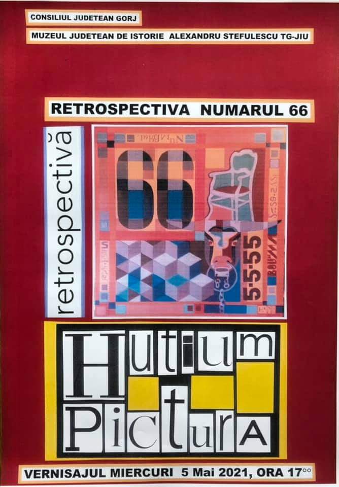 Miercuri, 5 mai 2021, de la ora 17.00, la Muzeul Județean Gorj “Alexandru Ștefulescu” din Târgu Jiu (str. Geneva, nr. 8), va avea loc vernisajul expoziției de pictură “Retrospectiva Șase-Șase”, a artistului Florin Hutium. Acesta descrie expoziția că fiind „o acumulare de lucrări de pictură realizate în ultimii zece ani, compoziții antimimetice aflate sub semnele cifrelor de 12 puncte scrise pe două babaroase cifrice.”