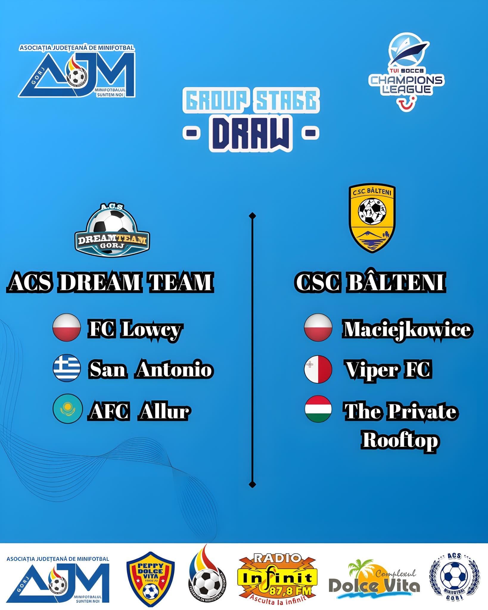 După participarea echipei ACS Peppy Dolce Vita la EMF EuroCup Masters (Sofia, Bulgaria), a venit rândul altor două echipe din competițiile organizate de AJM Gorj să reprezinte județul pe plan internațional. În perioada 17-20 octombrie 2025, ACS Dream Team și CSC Bâlteni vor lua startul la prestigioasa competiție TUI Socca Champions League, găzduită de Rethymno, Creta (Grecia).