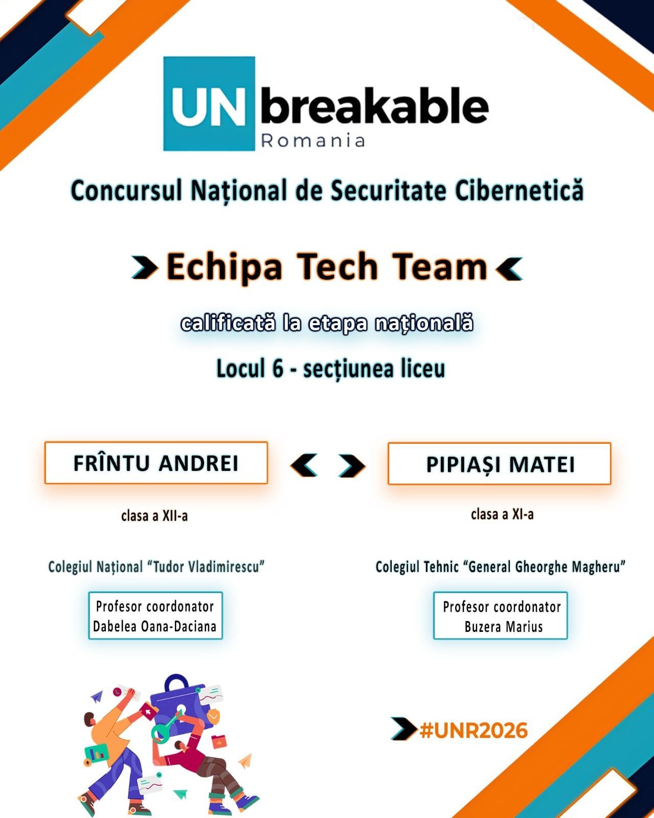 Echipa Tech Team, formată din elevii Matei Pipiași de la Colegiul Tehnic „General Gheorghe Magheru” și Andrei Frîntu de la Colegiul Național „Tudor Vladimirescu”, a obținut o nouă performanță remarcabilă. După o competiție intensă și multă muncă, cei doi s-au calificat la etapa națională a Concursului de Securitate Cibernetică UNbreakable România 2026.