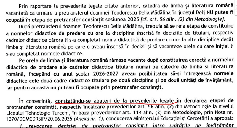 În consecință, „constatându-se abateri de la prevederile legale în derularea etapei de pretransfer consimțit, respectiv încălcarea prevederilor art.56 alin. (2) din Metodologie la nivelul Liceului Tehnologic Turceni”, conducerea Ministerului Educației a dispus reluarea procedurilor pentru constituirea normelor complete de 18 ore pe săptămână, exclusiv pentru titularii pe catedra de limba română.