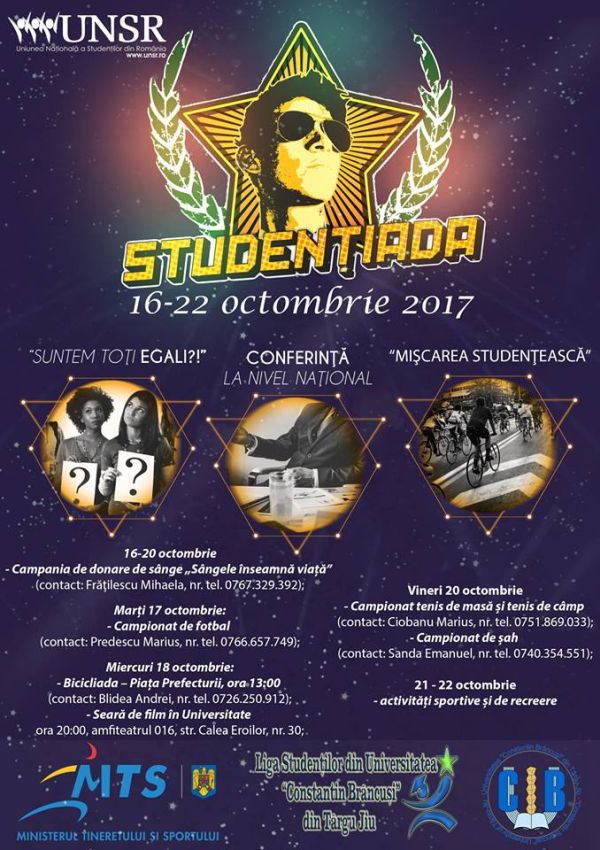 Studențiada a debutat, la Târgu-Jiu, luni, 16 octombrie, când a avut loc și începutul campaniei de donare de sânge “Sângele înseamnă viață”, campanie ce se va desfășura în fiecare zi, până la sfârșitul săptămânii. Marți, a avut loc Campionatul de fotbal, iar miercuri a fost Bicicliada – Piața Prefecturii, ora 13.00, ziua încheindu-se cu Seară de film în universitate, ora 20.00, amfiteatrul 016, str. Calea Eroilor, nr. 30; Astăzi, 19 octombrie, studenții continuă să se implice în Campania de donare de sânge “Sângele înseamnă viață”, după care vor fi prezenți la StudTalks. Vineri, 20 octombrie, se desfășoară: Campionatul tenis de masă și Campionatul de tenis de câmp, dar și un Campionat de șah. Sâmbătă – duminică sunt programate alte activități sportive și de recreere.