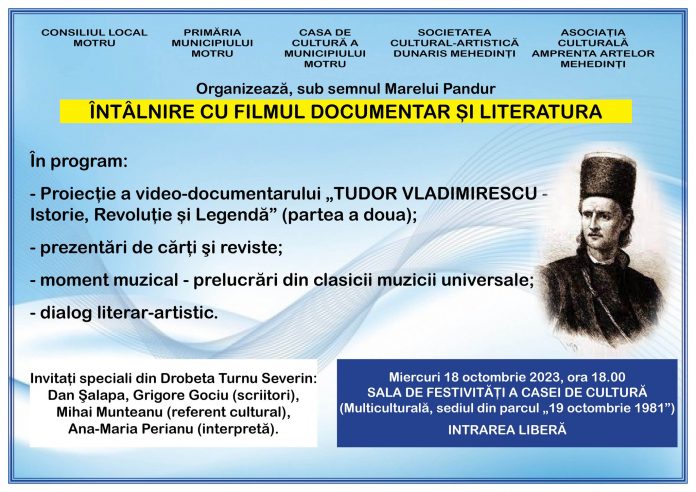 Diseară, de la ora 18:00, la sala de festivități a Casei Multiculturale Motru, va avea loc evenimentul ”Întâlnire cu filmul documentar și literatura”, organizat de Consiliul Local și Primăria Municipiului Motru, Casa de Cultură, Societatea Cultural-Artistică ”Dunaris” Mehedinți, Asociația Culturală ”Amprenta Artelor” Mehedinți.