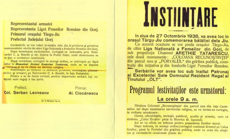 În dorinţa de a contribui cât de mult la ridicarea oraşului Târgu-Jiu şi mai ales pentru a preamări memoria eroilor gorjeni cari s-au jertfit în răsboiul de întregire, Liga Naţională a Femeilor Gorjene vă aduce la cunoştinţă că a hotărât să dăruiască oraşului o Coloană şi un Portal de piatră – opere ale marelui sculptor Brâncuşi, care în chipul acesta aduce un prinos de recunoştinţă judeţului său natal.