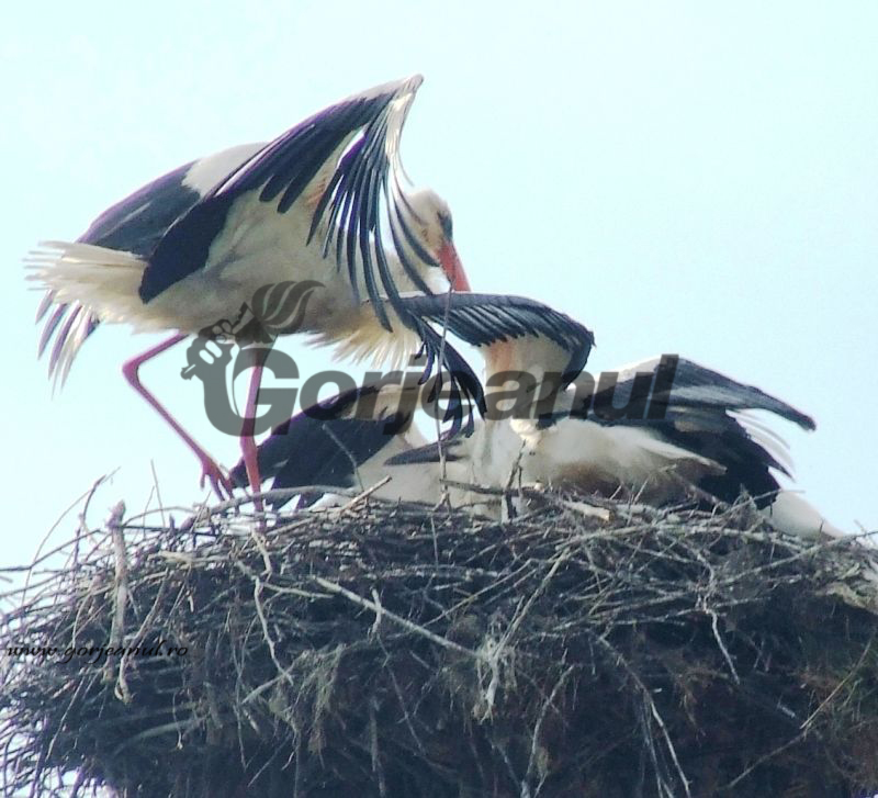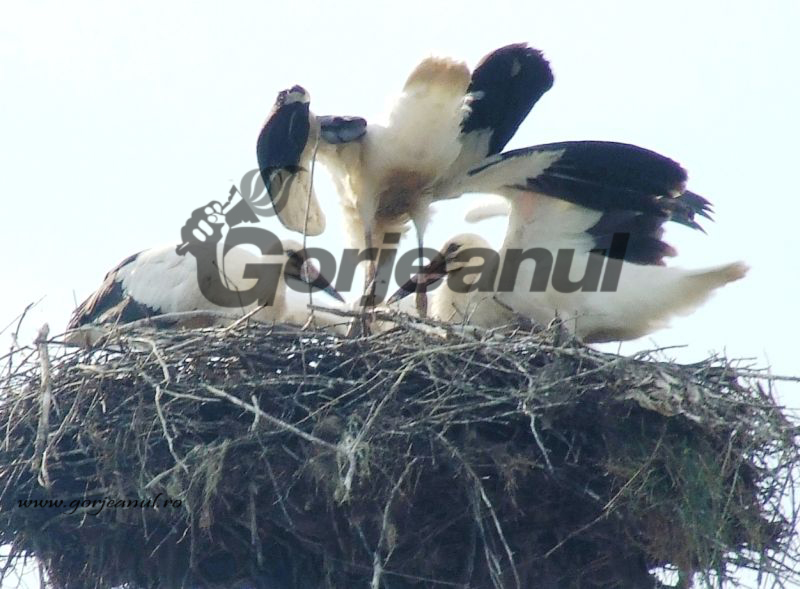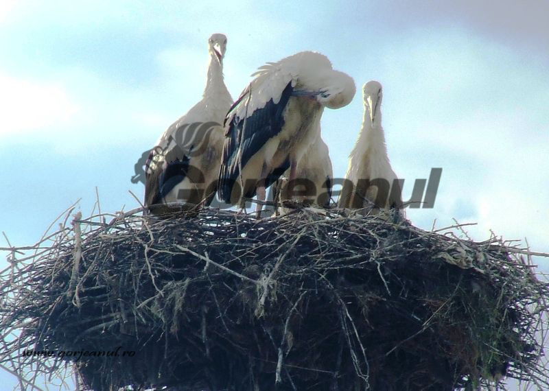 Intrând în vorbă cu nişte puşti ce se jucau pe la porţi am fost convins de către aceştia să mai stau puţin că urmează ca adulţii să vină să-şi hrănească puii şi o să am parte de un spectacol pe cinste. Într-adevăr nu după mult timp au venit bărzoii de la baltă probabil cu hrana îngurgitată şi au început să o împartă la puii ce până atunci stătuseră cuminţi parcă ştiind că peste puţin timp or să primească de mâncare. Trebuie să mărturisesc că aşa cum am fost în primăvară de-a binelea impresionat de jocul aripilor şi „toaca” din plisc a acestor simpatice păsări şi acum la sosirea în cuib în prezenţa puilor ce probabil cunoşteau ritualul adulţii au avut un program de-a dreptul mistic ce m-au dus cu gândul la şamanii amerindieni şi incantaţiile lor ancestrale.