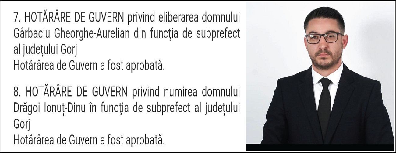 Schimbarea anunțată la nivelul Prefecturii Gorj a devenit oficială. Guvernul României a aprobat, în ședința din această după-amiază, eliberarea din funcție a subprefectului liberal Iani Gârbaciu și numirea social-democratului Ionuț Drăgoi în această funcție.