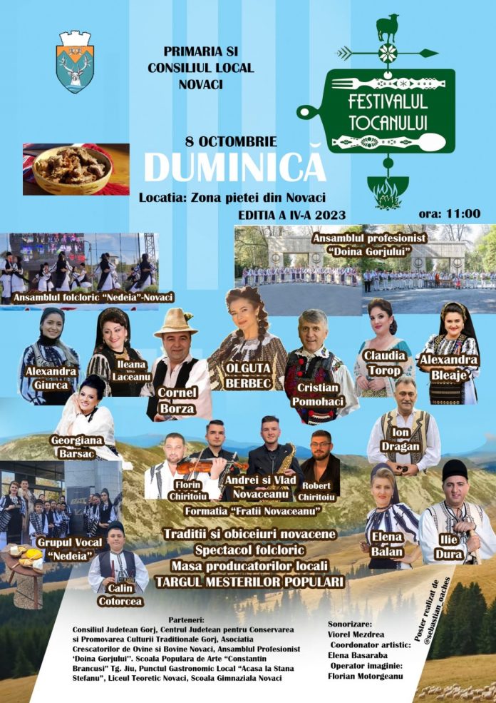 Duminică, la Novaci, în cadrul ediției a patra a Festivalului Tocanului, autoritățile locale au pregătit un program cu adevărat impresionant pentru cei ce vor lua parte la manifestări. Participanții vor putea vedea tradiții și obiceiuri novăcene, un târg al meșterilor populari, dar vor avea parte și de un adevărat regal folcloric. Dintre artiștii care vor cânta duminică după-amiaza la Novaci amintim: Olguța Berbec, Cristian Pomohaci, Georgiana Bârsac, Alexandra Giurcă, Ion Drăgan, Claudia Torop, dar și mai multe grupuri folclorice, precum și Formația ”Frații Novăceanu”.