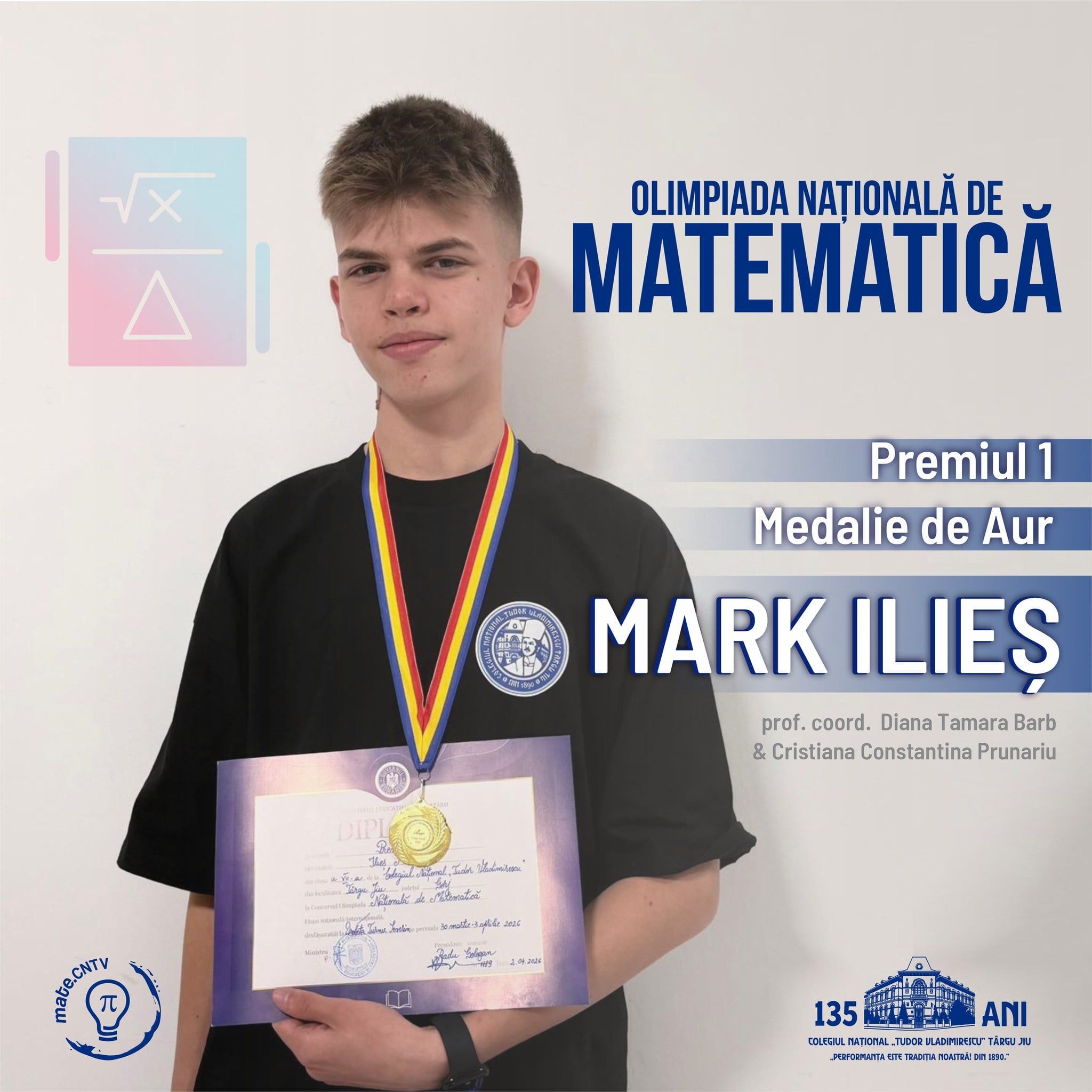 Mark Ilieș, elev în clasa a VII-a la Colegiul Național „Tudor Vladimirescu” din Târgu Jiu, a obținut locul I cu punctaj maxim la Olimpiada Națională de Matematică, fiind recompensat cu medalie de aur. În acest an, Mark a mai obținut medalie de aur și prima Mențiune acordată de Ministerul Educației la Olimpiada Națională de Informatică, precum și prima Mențiune MEC la Olimpiada Națională de Lingvistică. De asemenea, s-a calificat cu punctaj maxim la etapa națională a Olimpiadei de Chimie, care va avea loc la finalul lunii aprilie, la Sibiu.