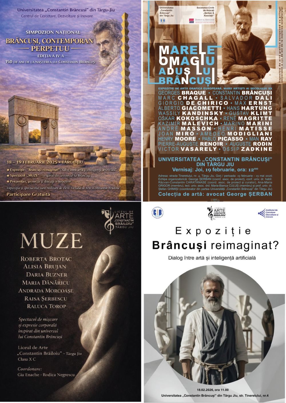 Pe 18 februarie 2026, între orele 10:30 și 15:30, la sediul universității din strada Tineretului nr. 4, va avea loc cea de-a IV-a ediție a Simpozionului Național „Brâncuși, contemporan perpetuu”, organizat de Institutul de Cercetare, Dezvoltare și Inovare. Evenimentul își propune să evidențieze influența operei lui Constantin Brâncuși asupra creației artistice contemporane, să exploreze relația dintre valorile estetice tradiționale și expresiile artistice actuale și să stimuleze dialogul între specialiști, artiști și public. Agenda cuprinde prezentări tematice și intervenții academice, expoziții de pictură, proiecții video și fotografii documentare, precum și sesiuni interactive de dezbatere. În cadrul simpozionului va fi organizată expoziția „Brâncuși reimaginat? Dialog între artă și inteligența artificială”, alături de spectacolul de mișcare și expresie corporală „MUZE”, creație artistică inspirată din universul estetic brâncușian. Ambele momente vor fi susținute de elevii Liceului de Arte „Constantin Brăiloiu”. Evenimentul este realizat în parteneriat cu instituții culturale și educaționale de prestigiu și este deschis publicului larg.