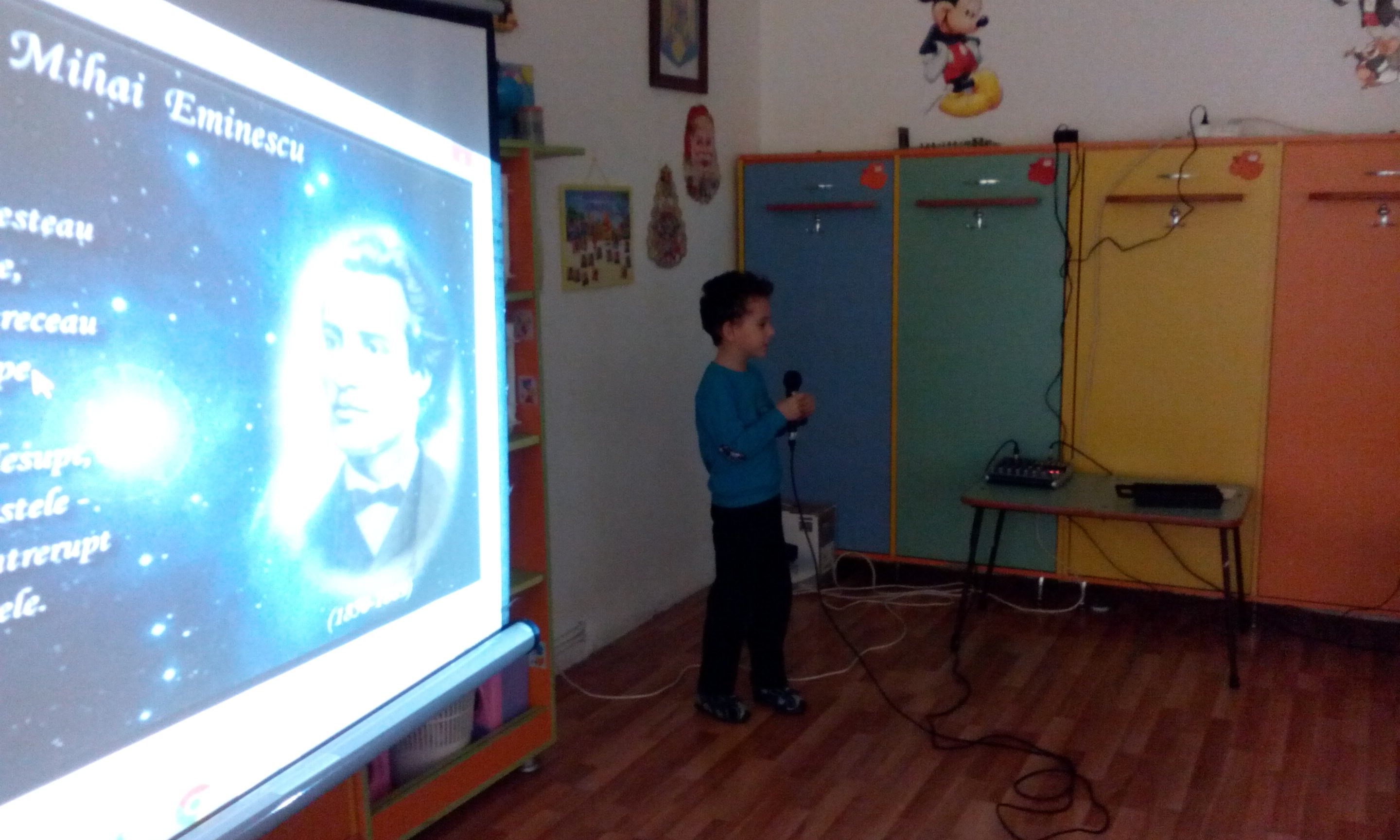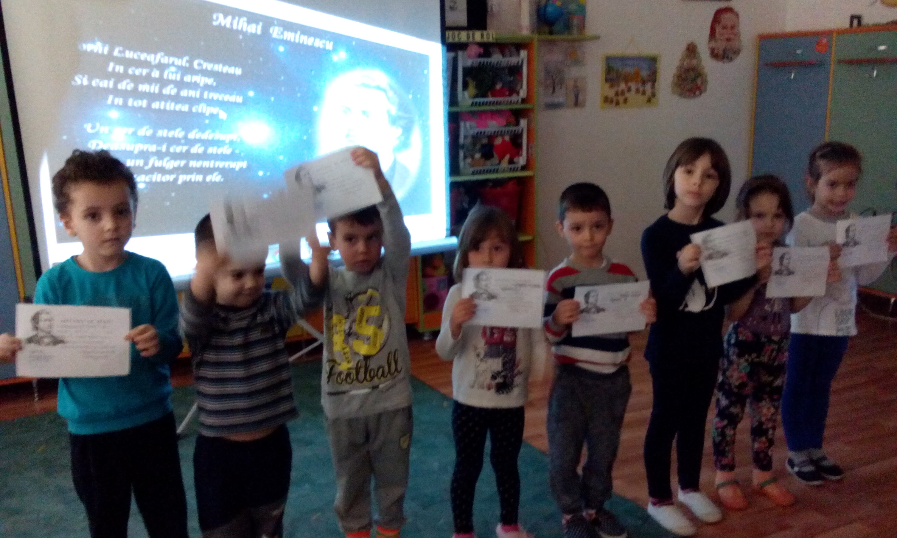 Coordonați de doamnele educatoare Bălănescu Camelia, Dăescu Roxana, Negrea Cristina, Draica Lorena, Pîrcălabu Domnica și Matei Cristina, prichindeii au realizat pe 15 ianuarie 2016 un mic program artistic cuprinzând versuri eminesciene. Efortul lor a fost răsplătit cu diplome de merit.