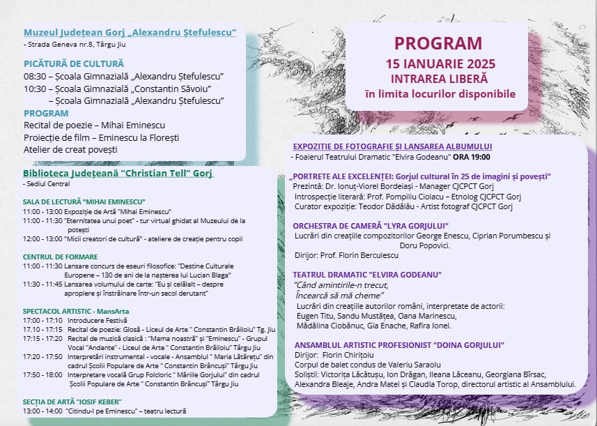 Un complex de manifestări intitulat „Când amintirile-n trecut încearcă să mă cheme…” va avea loc miercuri, 15 ianuarie 2025, la Târgu Jiu, prin care se dorește omagierea operei lui Mihai Eminescu cu ocazia Zilei Culturii Naționale.