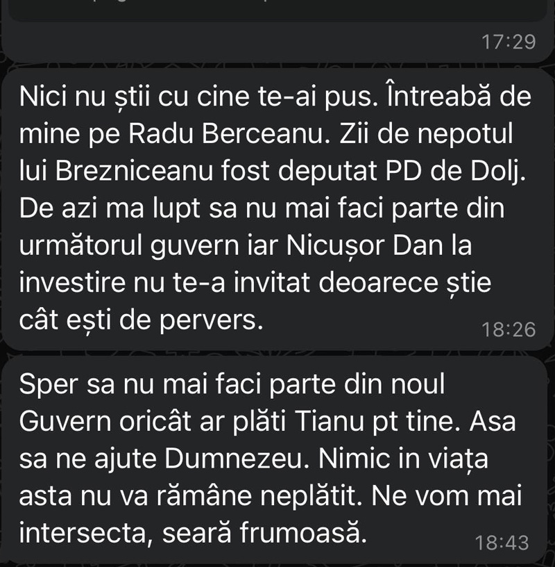 *„Nici nu știi cu cine te-ai pus. Întreabă de mine pe Radu Berceanu. Zii de nepotul lui Brezniceanu fost deputat PD de Dolj. De azi mă lupt să nu mai faci parte din noul Guvern iar Nicușor Dan la investire nu te-a invitat deoarece știe cât ești de pervers. Sper să nu mai faci parte din noul Guvern oricât ar plăti Tianu pt tine. Așa să ne ajute Dumnezeu. Nimic în viața asta nu rămâne neplătit. Ne vom mai intersecta, seară frumoasă”, continuă mesajul.
