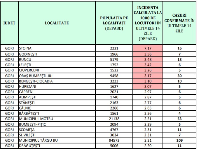 Opt localități din Gorj se află în scenariul roșu: Stoina, Godinești, Runcu, Lelești, Ciuperceni, Bumbești-Jiu, Bengești-Ciocadia și Hurezani. La Stoina se înregistrează o rată de infectare cu noul coronavirus de 7,17 cazuri la mia de locuitori.
