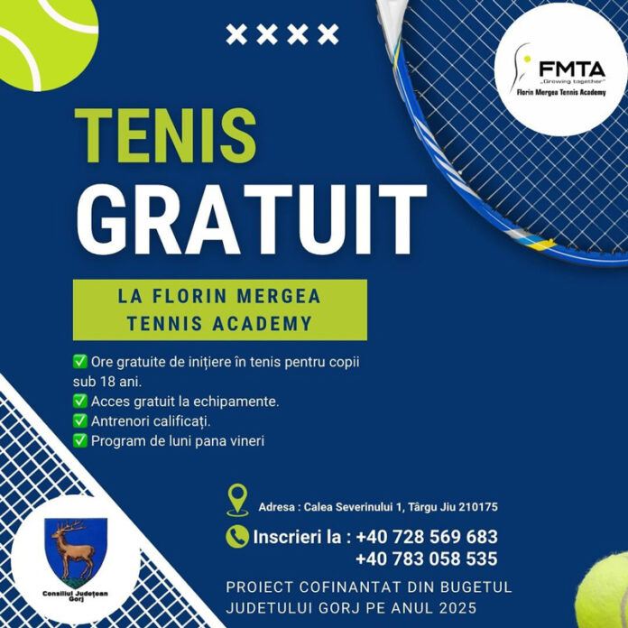 Academia de Tenis Florin Mergea oferă tinerilor sub 18 ani oportunitatea unică de a învăța tenisul într-un mediu profesionist, cu ore de inițiere gratuite, acces gratuit la echipamente și antrenori calificați. Proiectul este cofinanțat din bugetul județului Gorj pe anul 2025, în parteneriat cu Consiliul Județean Gorj. Înscrierile se pot face la numerele de telefon: 0728 569 683 și 0783 058 535. Inițierea are loc, de luni până vineri, la baza din Calea Severinului 1 (Târgu Jiu).