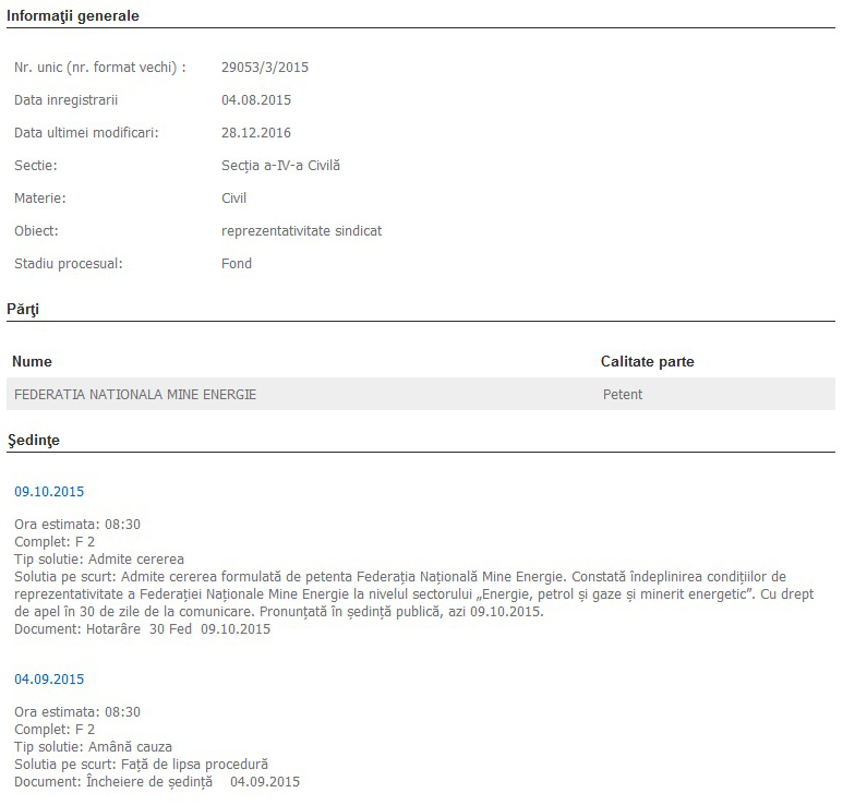 Conform unei sentințe a Tribunalului București, date în 20 ianuarie 2017, Federația Națională Mine Energie are reprezentativitate sindicală numai în sectorul “extracție”. Asta deși în 2015, Tribunalul București a stabilit că reprezentativitatea sindicală a FNME era extinsă pe sectorul “Energie, petrol şi gaze şi minerit energetic”. Deși sentința din 20 ianuarie poate fi atacată cu apel, se pare că sindicaliștii FNME nu au reprezentativitate sindicală solicitată de Complexul Energetic Oltenia, pentru negocierea Contractului Colectiv de Muncă, procedură ce va începe oficial pe 9 februarie, primele etape fiind inițiate pe 3 februarie.