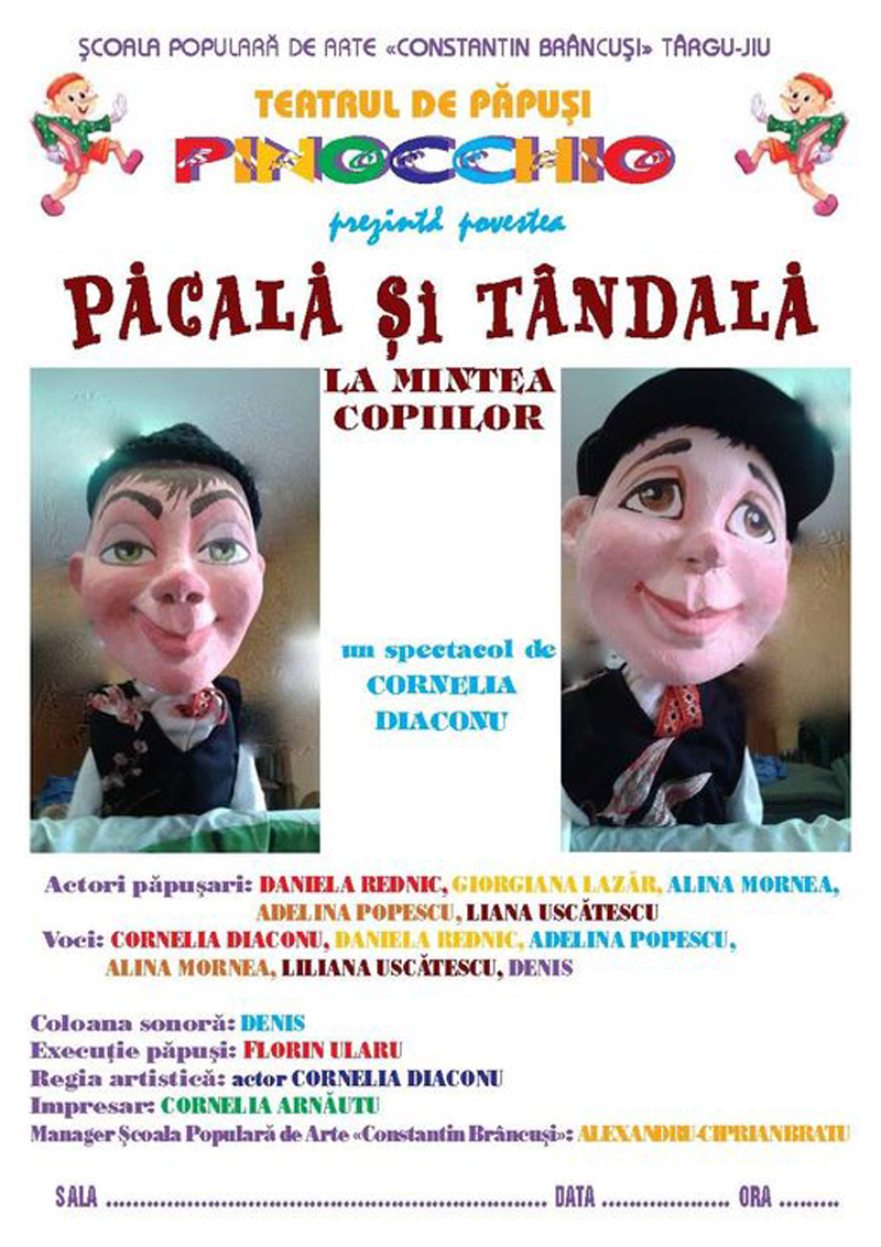 Teatrul de Păpuși ,,Pinocchio”, din cadrul Școlii Populare de Arte ,,Constantin Brâncuși” Târgu- Jiu, vă invită duminică, 11 aprilie, ora 11.00, la Teatrul Dramatic ,,Elvira Godeanu” din Târgu-Jiu, la spectacolul ,,Păcală și Tândală – La mintea copiilor”, o poveste scrisă și regizată de actrița Cornelia Diaconu. Din distribuție fac parte actorii păpușari: Daniela Rednic, Adelina Popescu, Alina Mornea, Georgiana Lazăr și Liliana Uscătescu. ,,Actorii teatrului de păpuși vor aduce pe scenă două personaje autohtone, pe Tândală și Păcală, care vor da viață poveștii și realism aventurilor prin care vor trece. Spectacolul este unul energic, din piesă nu vor lipsi dansurile și cântecelele. Copiii vor merge alături de actori într-o călătorie plină de peripeții și vor învăța cât de importantă este școala. Vă așteptăm cu mare drag să vă bucurați de clipe minunate alături de trupa de păpușari profesioniști <<Pinocchio>>”, au anunțat organizatorii. Prețul unui bilet este de 7 lei. Accesul în sala de spectacole se va face în limita a 67 de locuri (30% din capacitatea sălii).
