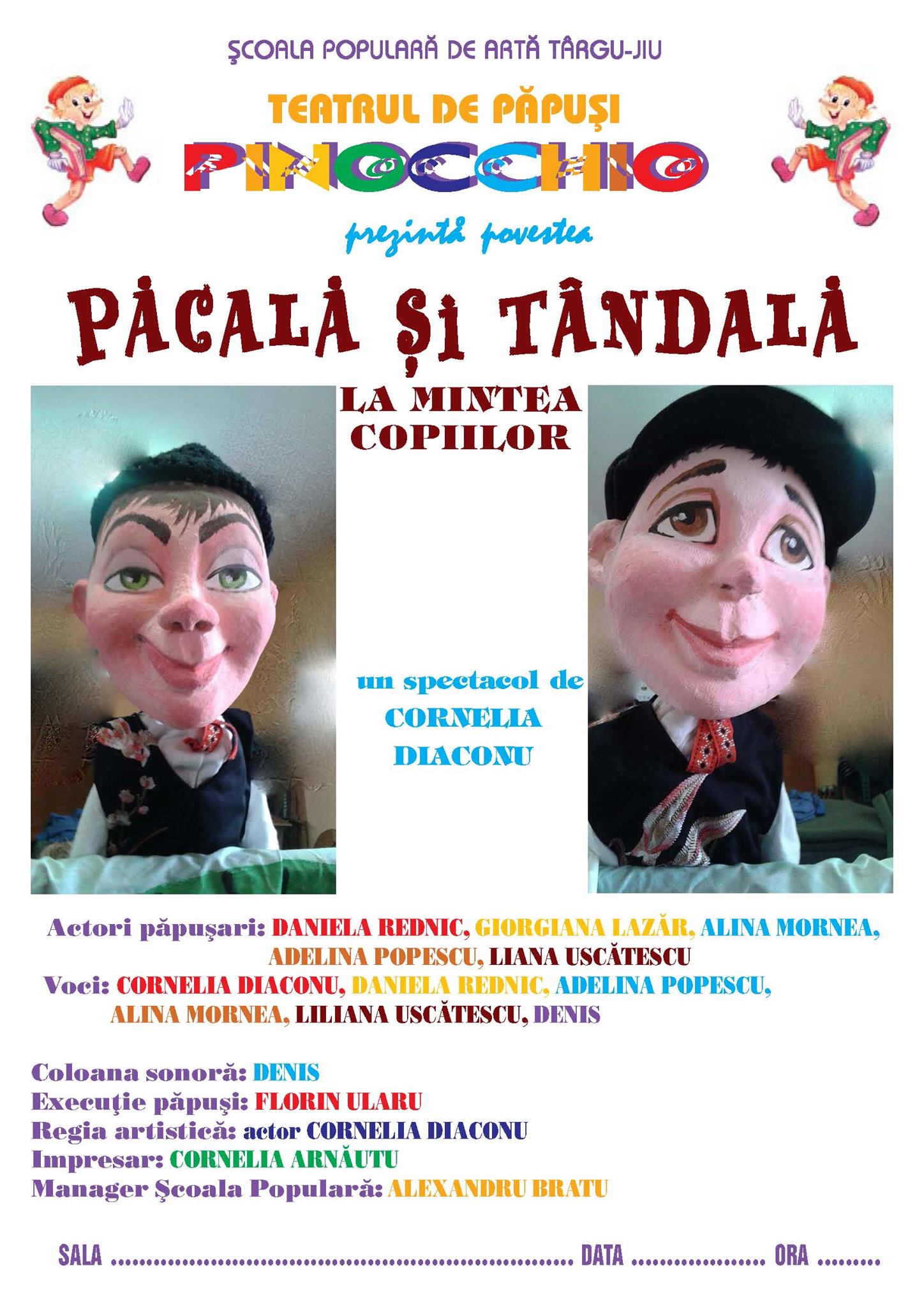 Două personaje îndrăgite de copiii de toate vârstele, Păcală și Tândală, revin, la sfârșitul acestei săptămâni pe scena Teatrului de Vară din Târgu-Jiu, într-un spectacol ce va fi pus în scenă de actorii Teatrului de Păpuși ,,Pinocchio”. Prețul unui bilet este de 7 lei. Dacă vremea va fi nefavorabilă, spectacolul va fi amânat și reprogramat ulterior.