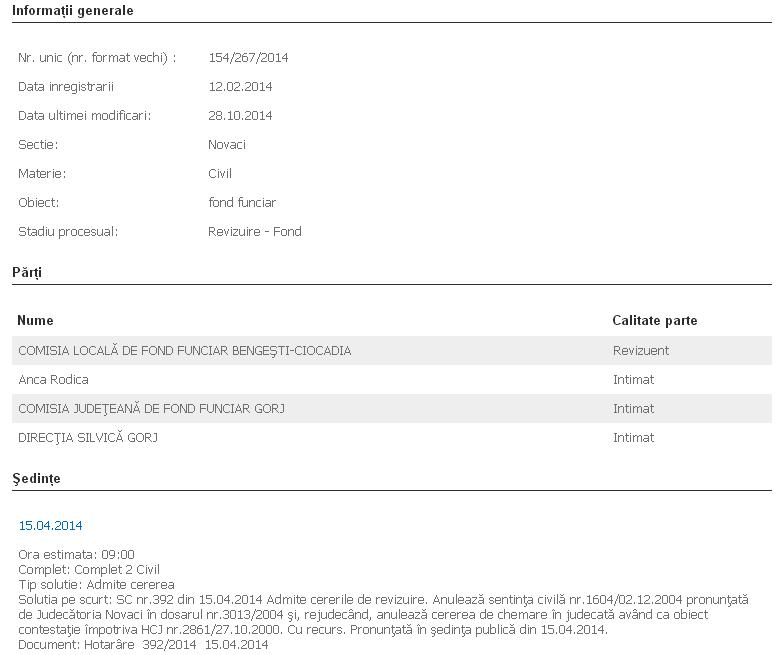 Femeia devine totuşi proprietară în acte, în timp ce ,,socrul” fostului secretar pune de fapt mâna pe pădure, femeia recunoscând anul trecut în faţa instanţei că nu a avut vreodată această suprafaţă de pădure. Hotărârea privind acordarea pădurii luate ilegal de Anca Rodica, şi ajunsă la fel de ilegal în proprietatea lui Zgripcea Ion, este însă anulată de instanţa Judecătoriei Novaci în dosarul nr.154/267/2014 prin sentinţa civilă nr.392 din 15.04.2014,rămasă irevocabilă prin hotărârea Tribunalului Gorj.
