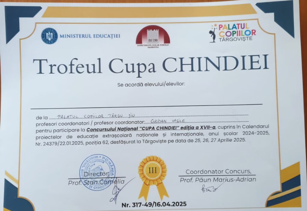 Echipa BitDragons de la Palatul Copiilor Târgu Jiu a obținut, pentru a treia oară consecutiv, marele trofeu al Concursului Național de Robotică pentru elevi „Cupa Chindiei”, desfășurat la Târgoviște în perioada 25-27 aprilie 2025.