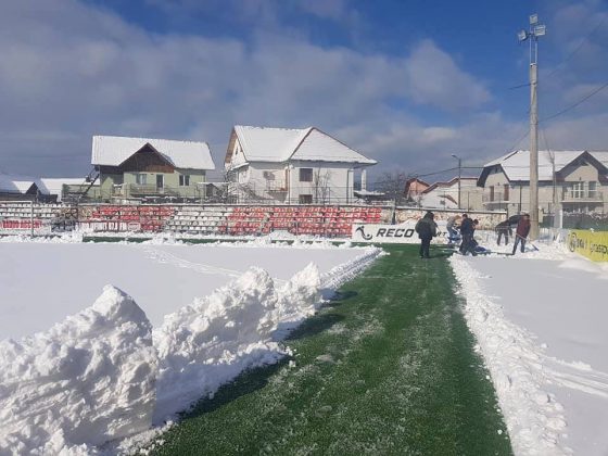 La Târgu Jiu a nins abundent, iar terenul sintetic a fost acoperit de zăpadă. Organizatorii fac eforturi ca suprafaţa de joc să se prezinte duminică în condiţii cât mai bune.