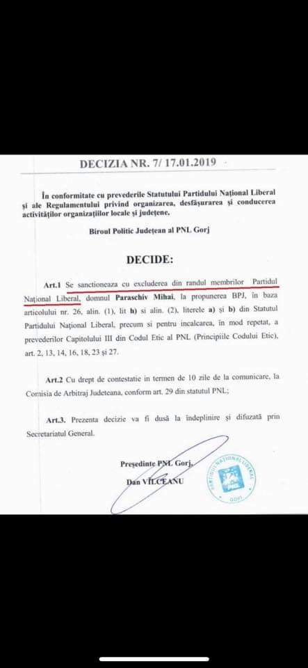 Mihai Paraschiv, consilier municipal PNL, a fost exclus la finalul acestei săptămâni din partid, în cadrul unei ședințe a BPJ, în cadrul căreia colegul său Pecingină a scăpat de sancțiune. Deși a anunțat că va contesta decizia luată de BPJ-ul PNL Gorj, prin mesajul postat azi pe Facebook, Paraschiv arată că nu va mai apela la această măsură care în atare condiții nu îi va aduce un câștig de cauză.
