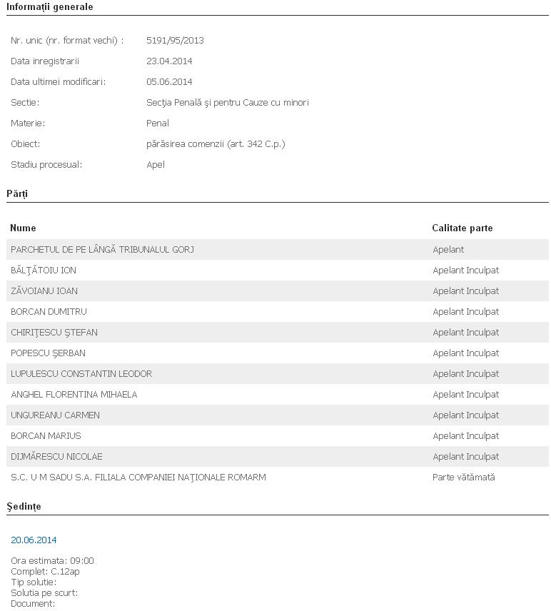 Nicolae Dijmărescu, fostul director general al UM Sadu, a primit un an de închisoare cu suspendare şi un an interzicerea unor drepturi civile. Alte cinci persoane inculpate în dosar, agenţi de pază şi muncitori, au fost obligaţi de instanţă să achite o amendă administrativă de 290 de lei, însă suma va fi dedusă din cele 24 de ore în care au fost reţinuţi în 2013. Sentinţa magistraţilor de la Tribunalul Gorj putea fi atacată cu recurs. Lucru la care s-a apelat. Băltăţoiu a declarat recurs, iar restul apel ca şi Parchetul de pe lângă Tribunalul Gorj, procurorul de caz fiind nemulţumit de sentinţa instanţei din Târgu-Jiu.