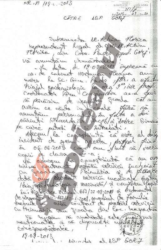 De altfel, printr-o adresă pe care v-o prezentăm integral mai jos, dr. Achim din Padeş, sesizează, în scris, DSP Gorj că a fost scoasă afară din şcoală de directorul Pora, asta în faţa a doi părinţi. “Aducem la cunoştinţă că este al doilea incident de genul acesta, primul fiind în 6.06.2013 când am vrut să vaccinăm copiii de clasa a VIII-a. Vă aducem la cunoştinţă că nu avem niciun contract de prestări servicii încheiat cu şcoala sau cu Primăria Padeş dar, de fiecare dată, am prestat servicii medicale gratuit, tiraj epidemiologic şi vaccinări, deşi conform legislaţiei în vigoare, adică potrivit Ordinului 653/25.09.2011 şi Ordonanţei de Urgenţă nr. 162-12.11. 2008, medicul de familie trebuie să aibă contract de prestări servicii cu Primăria sau cu Şcoala din localitatea respectivă”, transmitea Dr. Florica Achim din Padeş la DSP Gorj pe 20 septembrie 2013.
