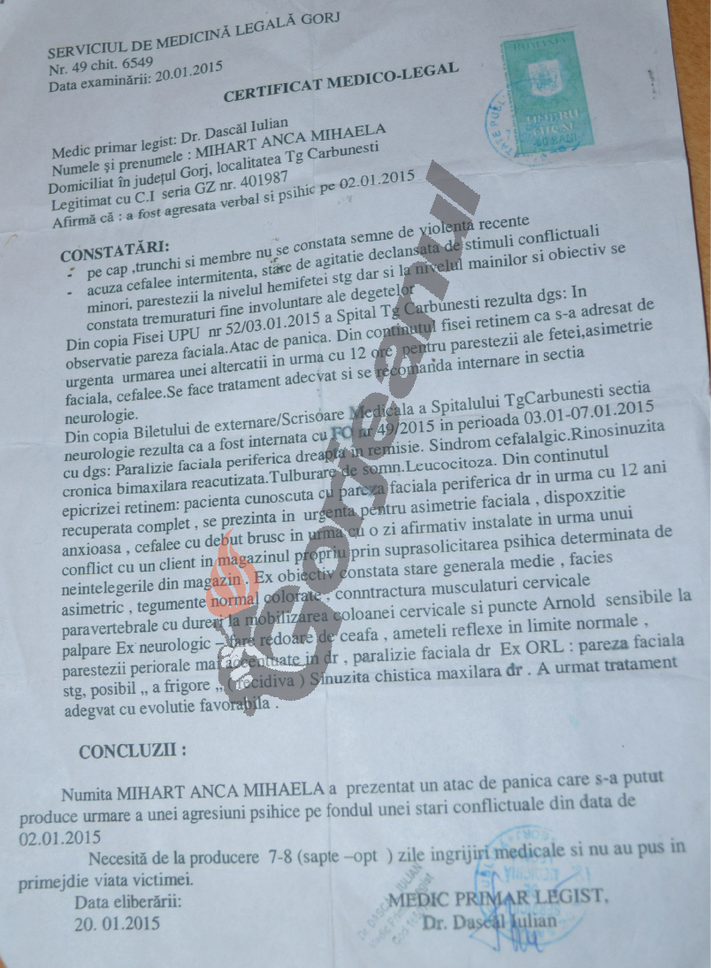 Anca Mihaela Mihart, administratorul unei firmei din Târgu-Cărbuneşti, a ajuns la spital cu probleme de sănătate foarte grave, după ce în magazinul pe care îl conduce, în casa proprie, a fost agresată, fără vreun motiv plauzibil, de o persoană de etnie rromă, din localitate. Femeia a făcut chiar o pareză facială după ce Gheorghe Pantelică, zis ,,Fulger”, din oraş, a tăbărât peste ea în magazin solicitându-i înapoi suma de 4,66 de lei cu care soţia lui cumpărase anterior nişte fructe kiwi. Patroana i-a restituit suma pretinsă, chiar şi cu 30 de bani mai mult, şi l-a rugat să nu mai intre în magazin, ştiindu-l cu antecedente penale. Respectivul nu s-a conformat însă cererilor şi, potrivit acesteia, a ridicat mâna să o lovească pe patroană. Pentru a calma spiritele femeia a sunat la 112 şi l-a reclamat pe „Fulger”, care a fugit în momentul în care a văzut că se apelează Poliţia. În cauză s-a constituit dosar penal, motiv pentru care ,,Fulger”, nemulţumit, a ameninţat-o, recent, pe femeie că dacă nu îşi retrage plângerea îi va pune viaţa în pericol copilului acesteia, minor. Administratorul magazinului, speriat, a suferit un atac de panică care i-a recidivat o pareză facială.