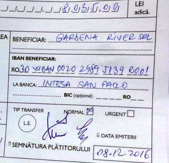 Săptămânal, CS Pandurii a ajuns să achite firmei lui Condescu câte 8000 de lei, cum se vede în documentul alăturat, banii băgându-se în contul firmei Gardena River prin banca Intesa San Paulo de la Tg.Jiu.