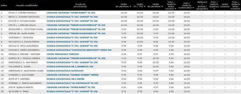 Ministerul Educaţiei Naţionale a publicat ierarhia mediilor pe baza cărora se va face admiterea la liceu anul acesta. În judeţul Gorj, doar patru elevi vor intra la liceu cu media 10, ceea ce înseamnă că au obţinut numai note maxime atât pe parcursul anilor de gimnaziu, cât şi la cele două probe din cadrul Evaluării Naţionale. Toţi patru provin de la unităţi de învăţământ din municipiul Târgu-Jiu. În ordine alfabetică, cei patru viitori liceeni de 10 sunt: Fîcea Carmen Mihaela (Colegiul Naţional „Spiru Haret” Târgu-Jiu), Mitoi Sorana-Theodora (Şcoala Gimnazială „Constantin Săvoiu” Târgu-Jiu), Ştiucă Roxana-Elena (Şcoala Gimnazială „Constantin Săvoiu” Târgu-Jiu) şi Ţîrcă Miruna Dalia (Colegiul Naţional „Tudor Vladimirescu” Târgu-Jiu). La nivelul judeţului Gorj, alţi patru candidaţi au obţinut media 10 la Evaluarea Naţională iar mediile lor de admitere variază între 9.96 şi 9.99. Aceştia sunt: Dragomir Cristiana Ioana (Colegiul Naţional „Tudor Vladimirescu”) – 9.99, Vîrţan Alina Elena (Colegiul Naţional „Tudor Vladimirescu) – 9.99, Jilăveanu Teodora (Şcoala Gimnazială „Constantin Săvoiu) – 9.98 şi Nicolescu Flavia-Maria (Şcoala Gimnazială „Constantin Săvoiu) – 9.96. În Gorj, alţi 532 de elevi au medii de admitere între 9 şi 9.99, 774 între 8 şi 8.99, 704 între 7 şi 7.99, 616 între 6 şi 6.99, iar 442 între 5 şi 5.99. Medii sub 5 au 411 elevi. Cea mai mică medie de admitere înregistrată la nivelul judeţului nostru este 2.27 şi îi aparţine unei eleve de la Şcoala Gimnazială Nr. 1 Polovragi.