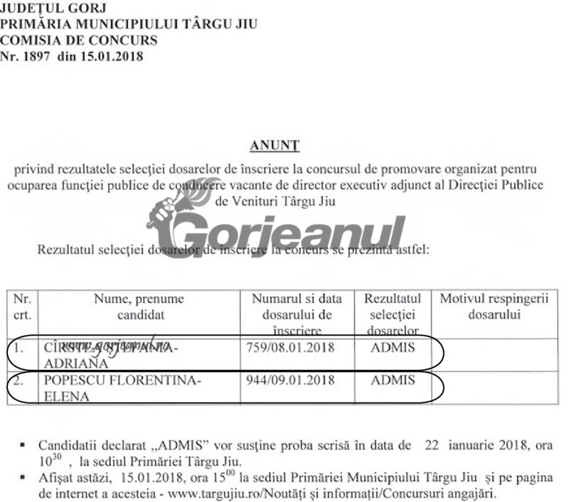 Pentru postul vacant de director adjunct s-au înscris două candidate, ambele angajate ale Primăriei Târgu-Jiu, mai exact ale Direcției Publice de Venituri. Este vorba despre Adriana Ștefania Cîrstea, juristă a instituției, și despre Florentina Elena Popescu, angajată a Serviciului Concesionări, ultima cercetată pentru mai multe abateri disciplinare la locul de muncă. Ambele au trecut însă proba de dosar pe data de 15 ianuarie 2018.