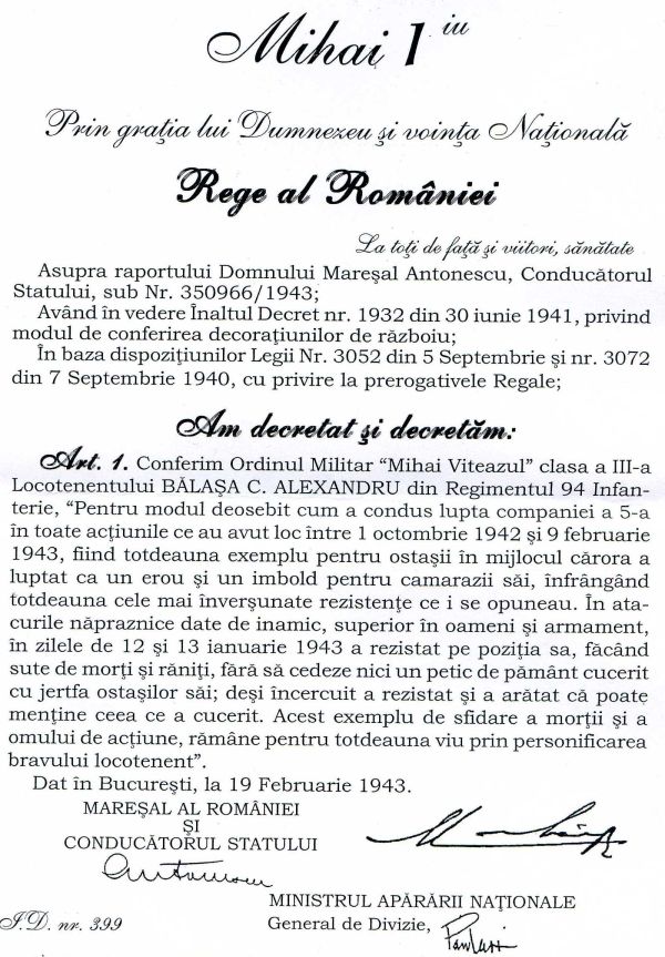Am onoare a înainta raportul de faţă şi tabelul nominal pentru acordarea ordinului “Mihai Viteazul” clasa a III-a, Locot. Bălaşa C. Alexandru, din Regimentul 94 Infanterie.