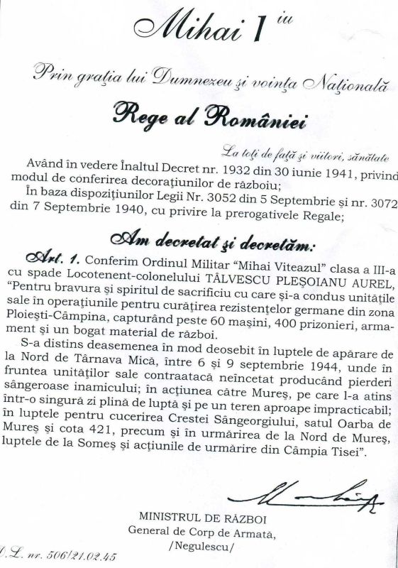 Pentru aceste fapte susţin propunerea de decorare cu Ordinul „Mihai Viteazul” clasa a III-a Lt. Colonelului Tâlvescu Pleşoianu Aurel, comandantul Regientului 3 Călăraşi Purtat