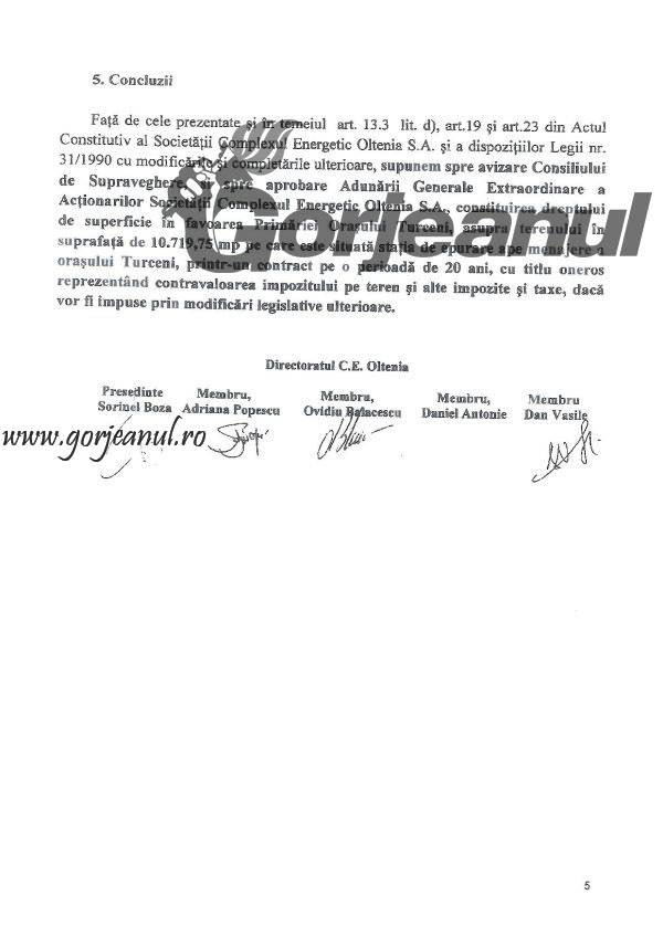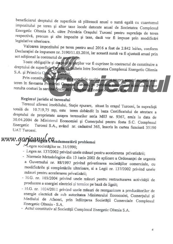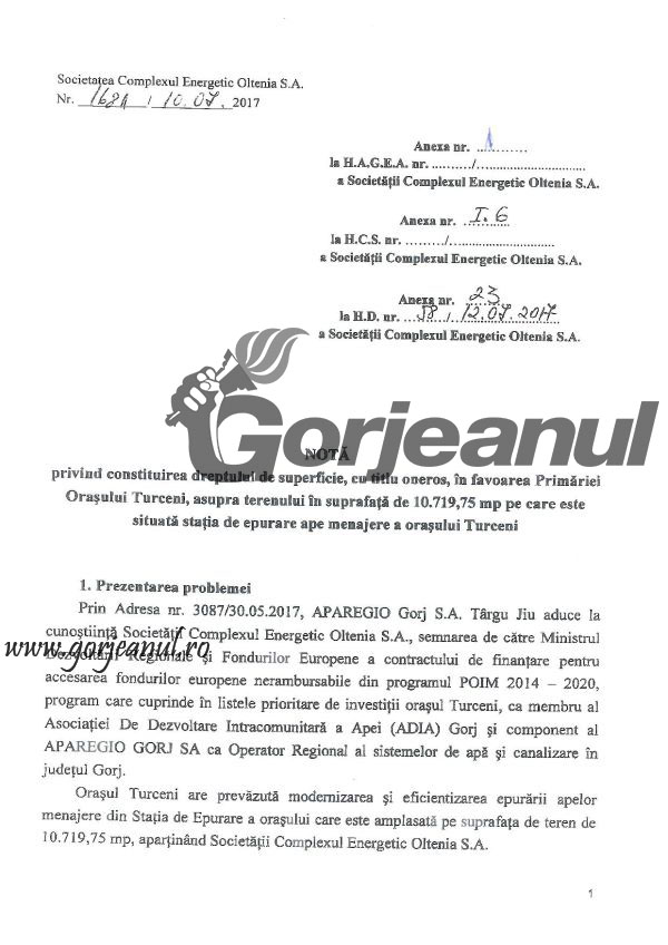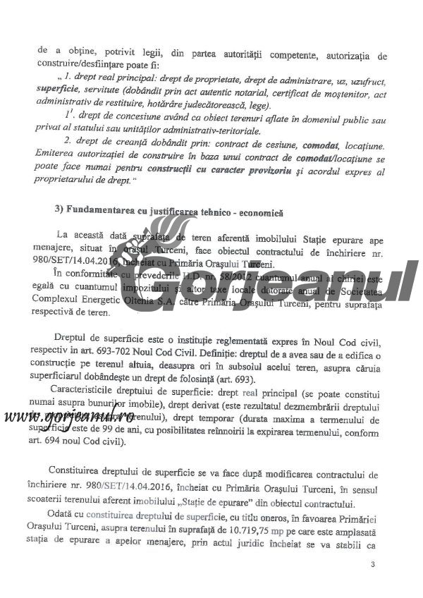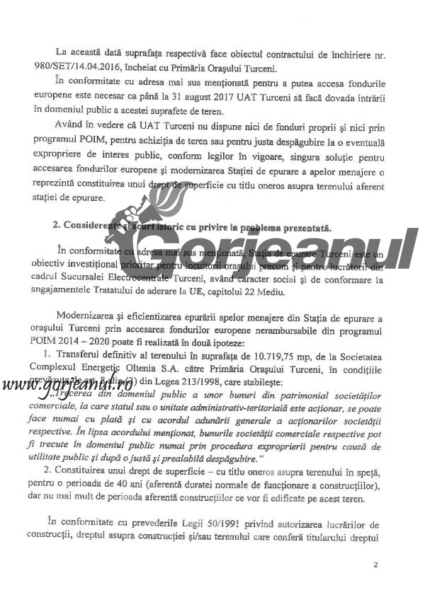 Momentan, suprafața de 10.719,75 de mp este parte a unui contract de închiriere încheiat, anul trecut, cu Primăria Turceni. Pentru a se accesa fonduri europene în vederea modernizării stației de epurare este necesar ca până la finalul acestei luni, autoritățile locale să facă dovada că terenul în cauză se află pe domeniul public. Avându-se în vedere că Primăria Turceni nu dispune de fondurile necesare realizării acestui proiect și nici de programul POIM, la care are însă acces Aparegio Gorj, singura soluție pentru accesarea banilor europeni este constituirea unui drept de superficie cu titlu oneros asupra terenului pe care se află stația de epurare.