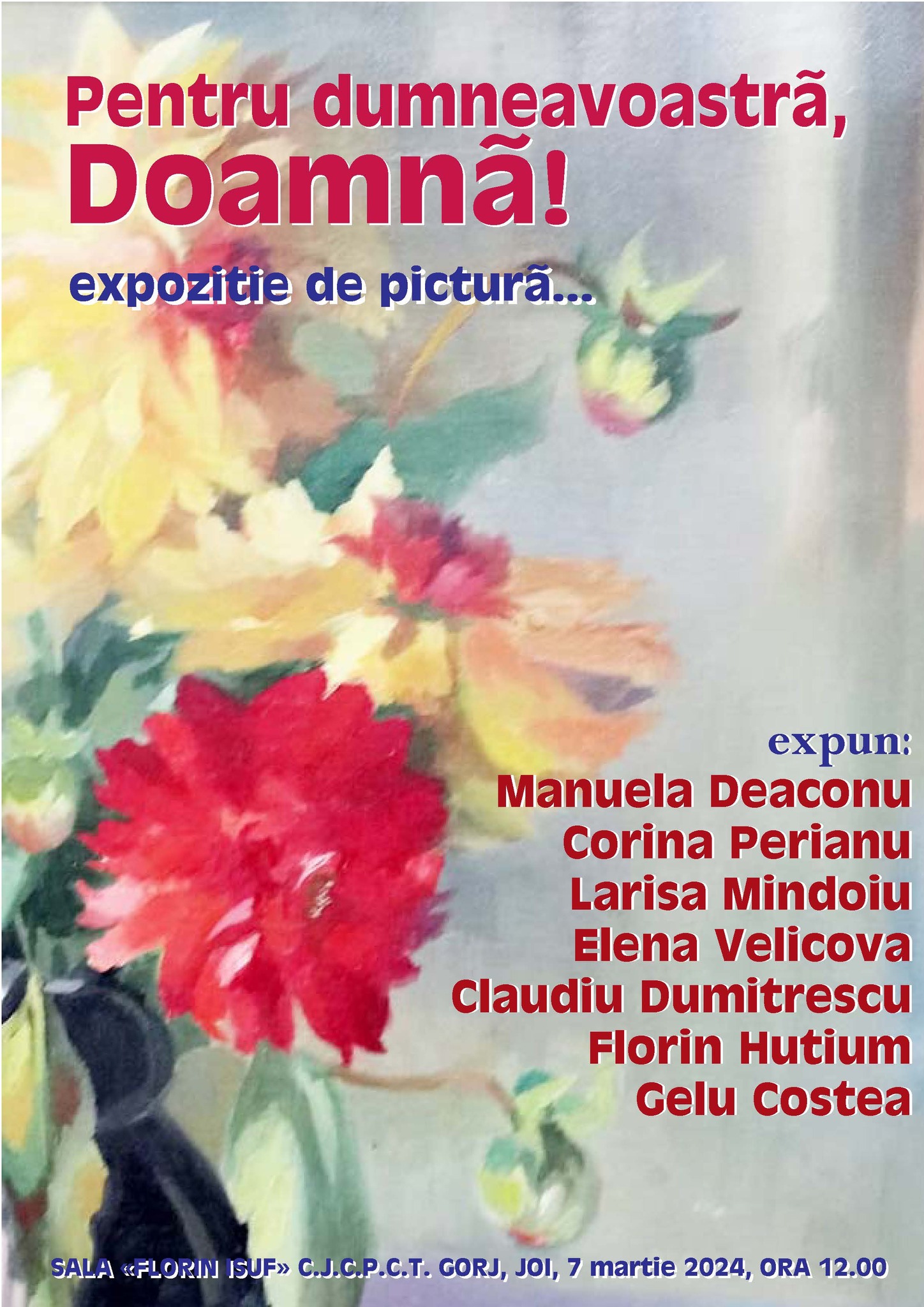 Astfel, joi 7 martie 2024, în preziua sărbătorii de 8 Martie – Ziua Internațională a Femeii – instituția de cultură amintită va organiza, cu începere de la ora 12.00, în sala ,,Florin Isuf”, vernisajul unei noi expoziții de pictură. Este vorba de expoziția ,,Pentru dumneavoastră, doamnă!”. Această expoziție, prilejuită de sărbătorirea zilei de 8 martie, va cuprinde lucrări semnate de Manuela Deaconu, Corina Perianu, Larisa Mindoiu, Elena Velicova, Florin Hutium și Gelu Costea. Așadar, după cum se poate observa, mai multe reprezentante ale sexului frumos vor expune, de ziua lor, mau multe lucrări de pictură ce vor încânta ochii și privirea tuturor celor care vor trece pragul sălii de expoziție ,,Florin Isuf” a Centrului Județean pentru Conservarea și Promovarea Culturii Tradiționale Gorj.