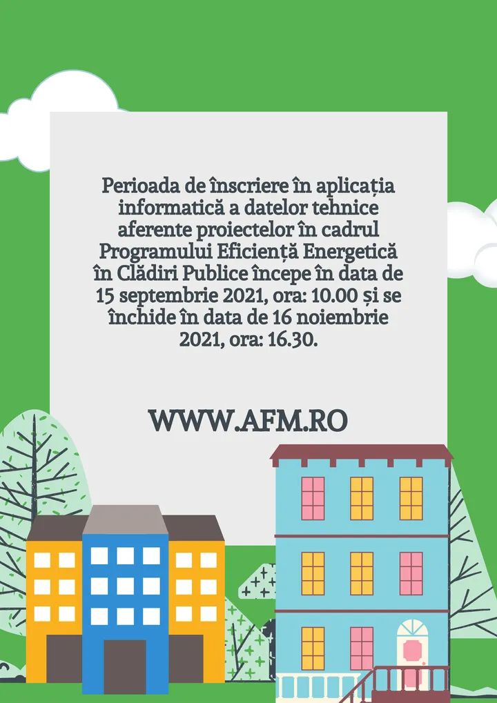 „Perioada de înscriere în aplicaţia informatică a datelor tehnice aferente proiectelor în cadrul Programului Eficienţă Energetică în Clădiri Publice începe în data de 15 septembrie 2021, ora: 10.00 şi se închide în data de 16 noiembrie 2021, ora: 16.30. Deşi în primă instanţă, Programul Eficienţă Energetică în Clădiri Publice a fost conceput doar pentru şcoli, au existat mai multe solicitări de completare a ghidului de finanţare iniţial. Noile modificări în sensul suplimentării categoriilor de beneficiari, suplimentării valorilor finanţate şi introducerii unor noi categorii de cheltuieli eligibile se vor regăsi în forma finală a ghidului. După publicarea în Monitorul Oficial, ghidul de finanţare va fi postat pe site-ul AFM, www.afm.ro, la secţiunea aferentă programului. Bugetul aprobat în anul 2021, pentru această categorie de proiecte este de 1,40 miliarde lei, mai mult cu cca. 1 miliard lei faţă de alocarea iniţială”, anunță AFM.