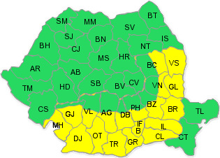 Administraţia Naţională de Meteorologie emis o atenţionare de Cod Galben de caniculă pentru astăzi în cea mai mare parte a Munteniei şi a Olteniei, dar şi în jumătatea de sud a Moldovei zone unde temperaturile maxime vor atinge frecvent 35…37 de grade, iar indicele temperatură-umezeală (ITU) va depăşi pragul critic de 80 de unităţi. Instabilitatea atmosferică se va accentua în cursul nopţii de miercuri spre joi (8/9 iulie) în regiunile din vestul şi nord-vestul ţării. Local vor fi intensificări ale vântului ce vor lua şi aspect de vijelie, frecvente descărcări electrice, căderi de grindină şi averse ce izolat pot avea caracter torenţial. Astfel de fenomene se vor semnala pe parcursul zilei de joi local în centru şi în est, precum şi în zonele montane, iar seara şi în sud şi sud-est.