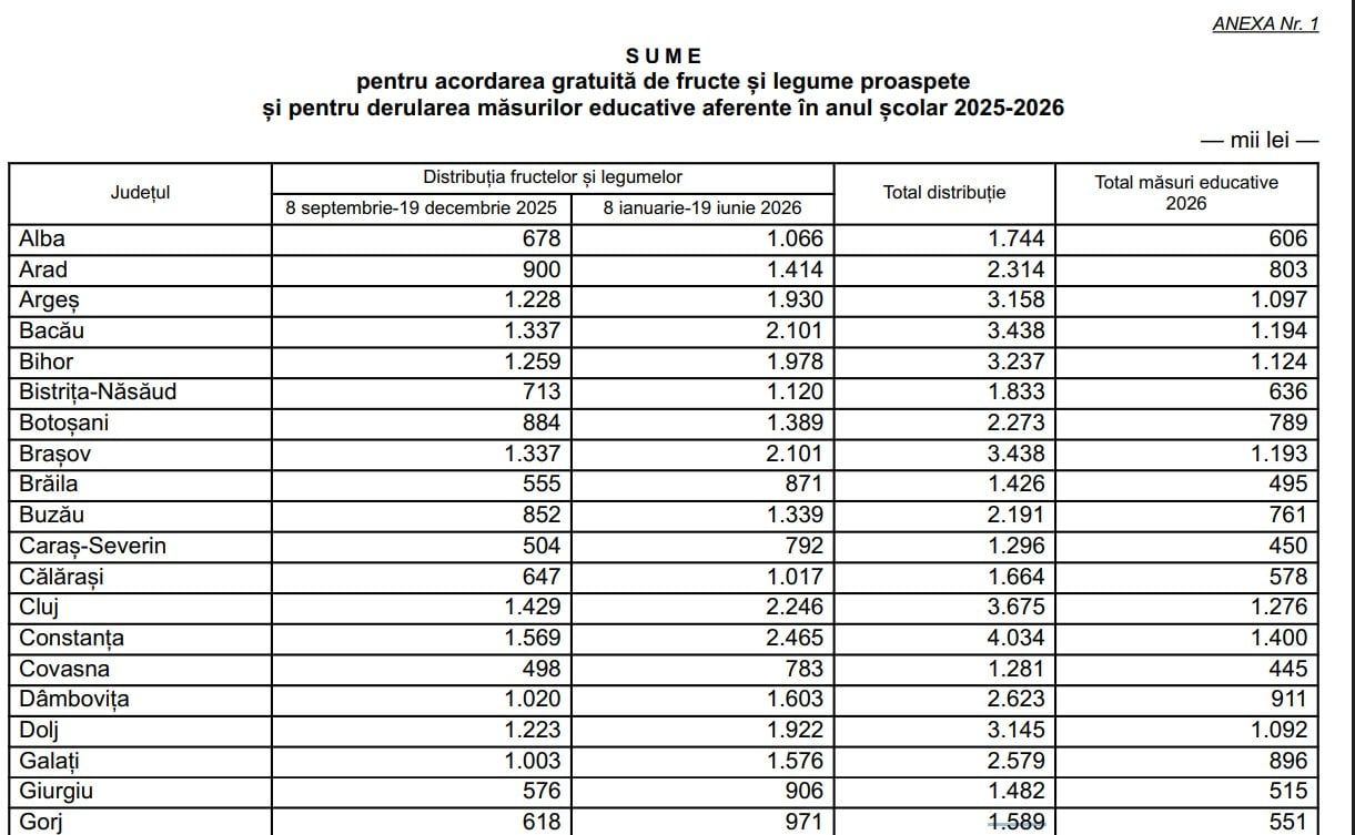 Pentru județul Gorj, suma totală alocată pentru acest an școlar depășește 11,8 milioane de lei. Concret, 1.589.000 lei sunt destinați achiziției de fructe și legume proaspete, 5.596.000 lei pentru lapte și produse lactate fără adaos de lapte praf, iar 3.604.000 lei pentru produse de panificație. În plus, pentru activitățile educative care însoțesc programul, se alocă câte 551.000 lei pentru componentele de fructe și lactate.