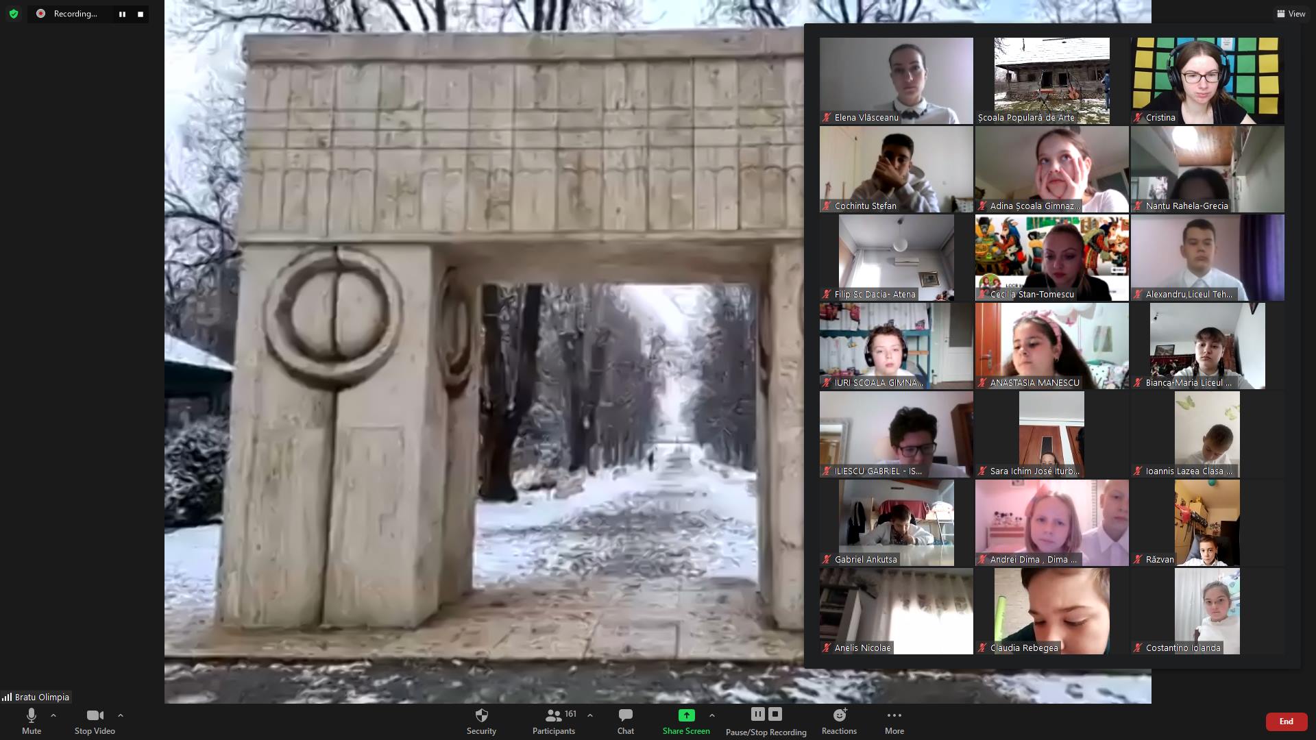 Valer Neag, care ne-a făcut o prezentare live a Coloanei Infinitului. Continuând călătoria noastră, am mers la doamna Olimpia Bratu, manager al Bibliotecii Județene ,,Christian Tell” Gorj, care ne-a încântat cu o transmisie live a sculpturilor: Poarta Sărutului, Aleea Scaunelor și Masa Tăcerii. Ne-am reîntors la doamna Lidia-Adriana Vasile, specialist în sculptură, meșter popular și instructor în cadrul Școlii Populare de Arte ,,Constantin Brâncuși” Târgu-Jiu, care ne-a prezentat în direct Casa Memorială ,,Constantin Brâncuși” de la Hobița. Tot la Târgu-Jiu am cunoscut-o și pe doamna Daciana Ungureanu, profesor de artă decorativă în cadrul Școlii Populare de Arte ,,Constantin Brâncuși”, care ne-a prezentat o colecție impresionantă de piese autentice de port popular, tablouri, vase pictate și obiecte realizate manual. Evenimentul s-a încheiat cu un recital din repertoriul Mariei Tănase, oferit