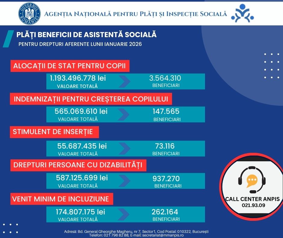 Agenția Națională pentru Plăți și Inspecție Socială (ANPIS), prin agențiile sale teritoriale, a virat integral, în luna februarie 2026, fondurile necesare achitării tuturor beneficiilor de asistență socială aferente lunii ianuarie.