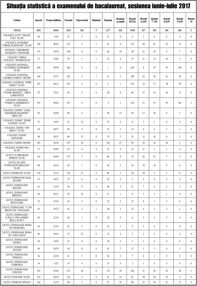 3210 candidați din Gorj au susținut prima sesiune a examenului de Bacalaureat 2017, care s-a desfășurat în zece centre din județul Gorj.