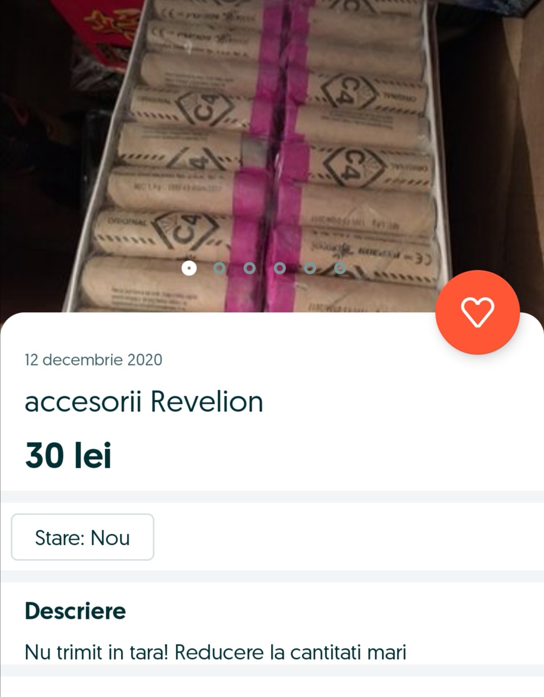 Deoarece polițiștii sunt în această perioadă cu ochii pe cei care vând ilegal petarde și artificii, prin orice mijloace, pentru noaptea de Revelion, gorjenii sunt inventivi! Un exemplu în acest sens este un bărbat dintr-un sat din comuna Padeș care vinde pe cel mai mare site de anunțuri din țară, petarde sun denumirea de „Accesorii Revelion”. Vânzătorul anunță însă că nu trimite prin colet în țară, dar face mențiunea că oferă reduceri celor care cumpără petarde de la el în cantități mari.